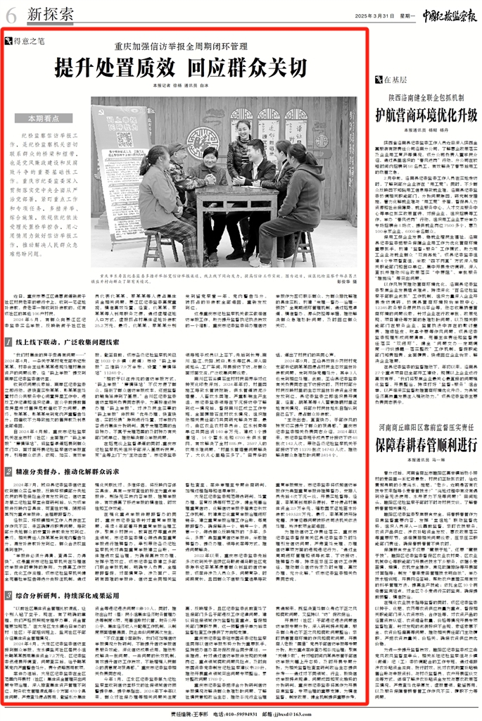 这是重庆市纪检监察机关做实做细信访举报工作、助力提升监督执纪执法质效的一个缩影。重庆市纪委监委将办理信访举报作为密切联系群众、为群众排忧解难的具体实践,构建“受理—督办—治理—预防”全周期闭环管理机制,通过拓宽渠道、精准督办、源头防控等举措,推动解决群众急难愁盼问题,及时回应群众关切。