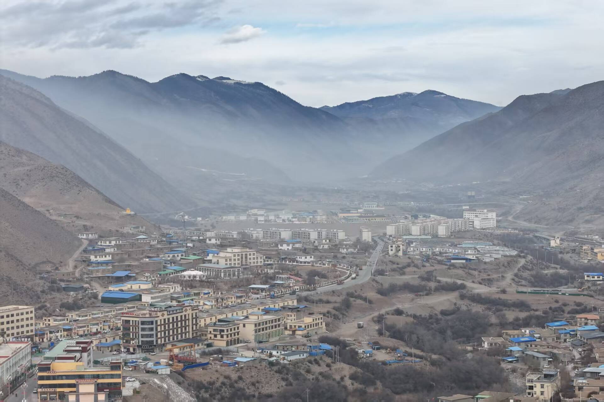 3月14日清晨,我们按照内地的作息时间出门,发现小镇还未苏醒。站在卓玛朗措曲大桥上远眺,那些被地质运动揉皱的山脊,在晨雾中显露出水墨般的褶皱。褶皱中刻印的,除了有千年茶马古道的历史,还有先烈们为守护西藏和平发展和人民幸福安康留下的红色印记,以及新时代的洛隆在高原天路上纵马疾驰的英姿。