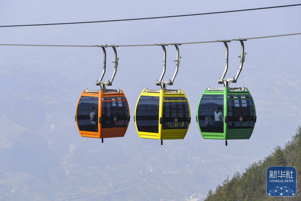 游客乘坐观光缆车在重庆奉节三峡之巅风景区游览(2024年3月11日摄)。