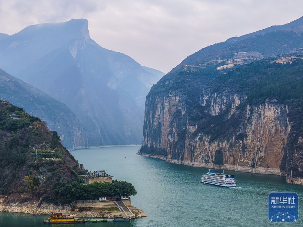 游轮行驶在重庆奉节瞿塘峡一带(2025年2月13日摄,无人机照片)。
