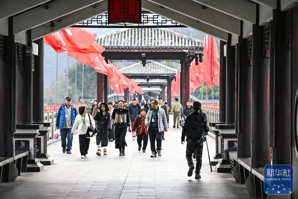 人们行走在重庆奉节一处人行天桥上(2025年2月12日摄,无人机照片)。