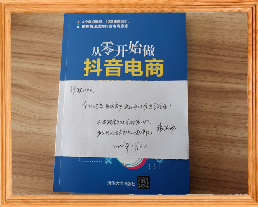 【物件讲述:这一本《从零开始做抖音电商》书籍是张承畅送给返乡创业青年程中坤的。程中坤网名“名模坤”在抖音账号上有100万粉丝,张承畅在赠言中写道:“依托电商服务家乡建功乡村振兴主战场。”】