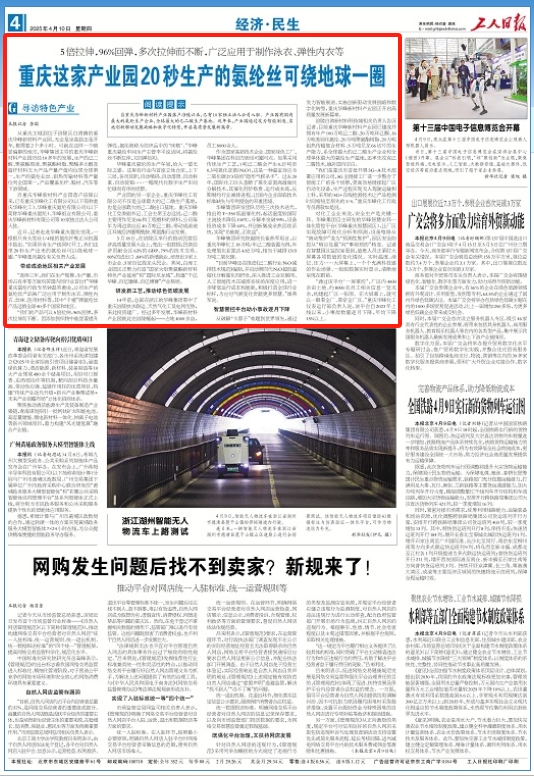 “我们的产品可以5倍拉伸,96%回弹,多次拉伸而不断。因添加到织物中能显著提升弹性,氨纶被称为纺织品中的‘味精’。”华峰重庆氨纶车间生产主管李平说话间,将氨纶丝不断拉伸,又回弹如初。