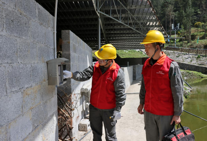 4月8日,国网重庆彭水供电公司桑拓供电所员工朱光荣和谢建波驱车前往重庆市彭水苗族土家族自治县桐楼乡普子村的“智慧渔场”,定期为养殖场排查线路隐患,助力乡村产业发展。