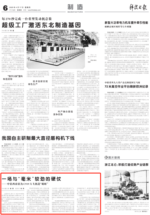 从实验室到生产线,中铝西南铝创造了多个第一:成为国内首家通过适航认证的航空铝材供应商,首次实现民用飞机锻件国产化,首次批量交付7050铝合金板材、锻件并实现自主可控。目前,中铝西南铝已为C919大飞机提供了各类高性能铝合金材料上千件,相关材料应用于C919起落架的轮毂、机翼、机身等关键部件。
