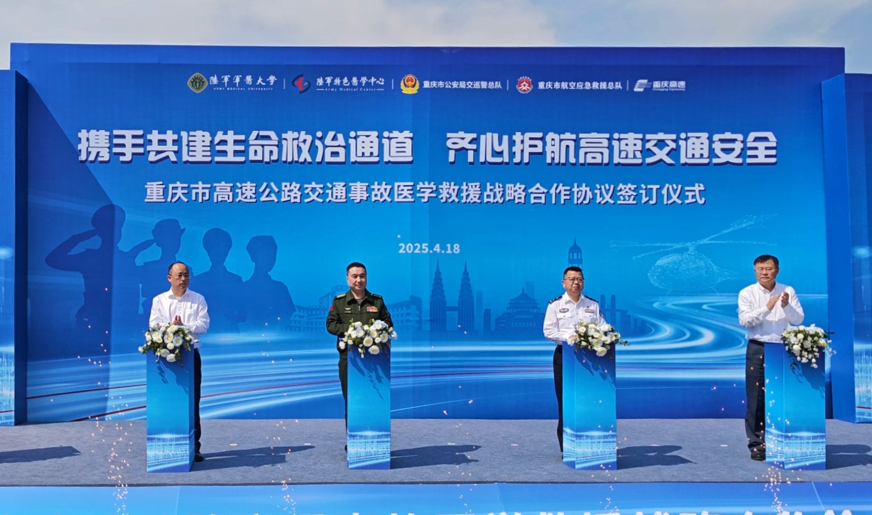 4月18日上午,陆军特色医学中心、重庆市公安局交巡警总队、重庆市航空救援总队、重庆高速集团在重庆市渝北区龙兴通用机场签署战略合作协议,启动高速公路交通事故航空救援联动机制。该机制旨在通过“空地警医一体”救援模式,整合航空救援、高速公路警务及医疗设施资源,突破地理与交通限制,构建覆盖全域、响应迅速、救治高效的立体化救援体系,为人民群众生命安全护航。