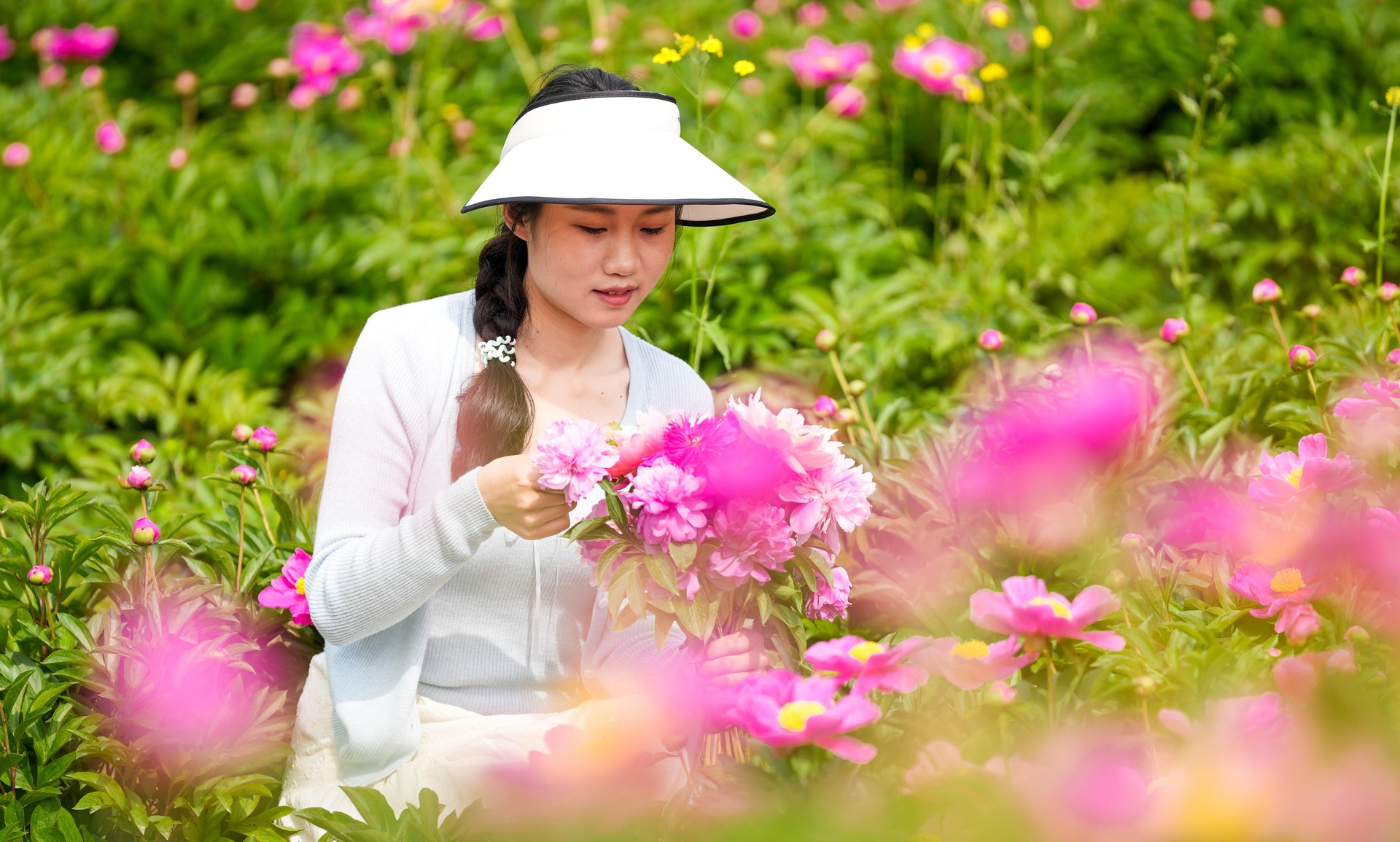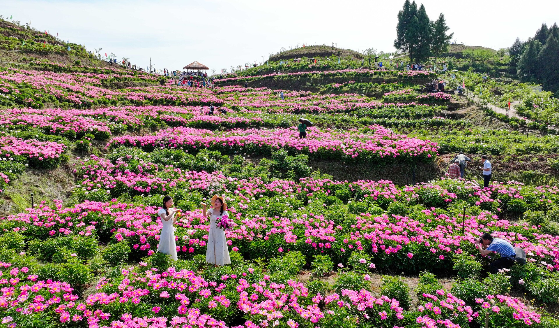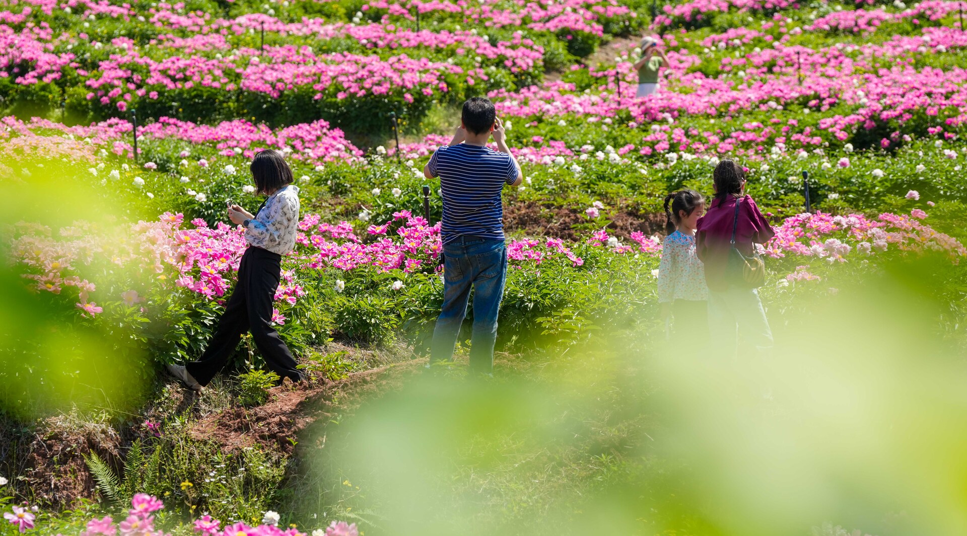 2025年4月,重庆市垫江县曹回镇徐白村芍药花基地,成片的芍药花竞相绽放,游客徜徉在花海里赏花。