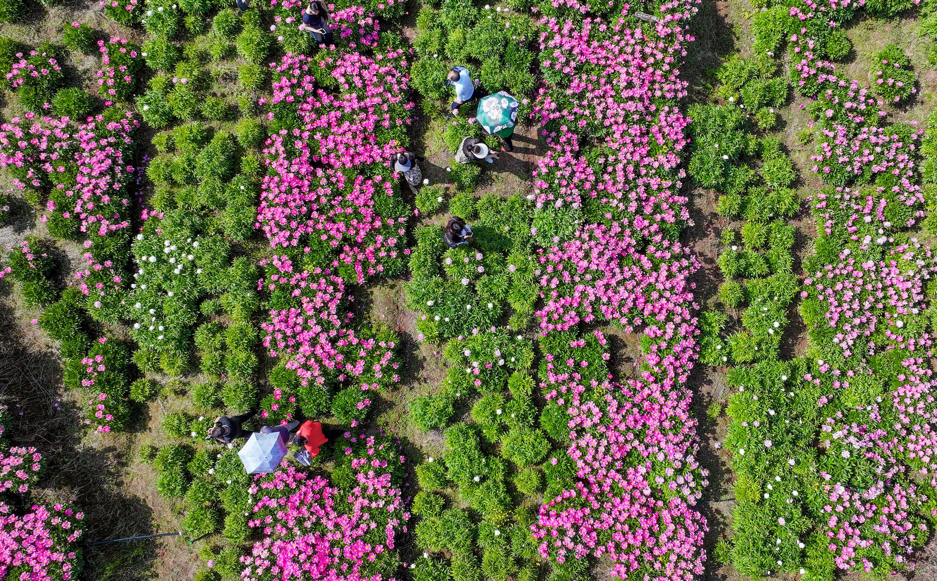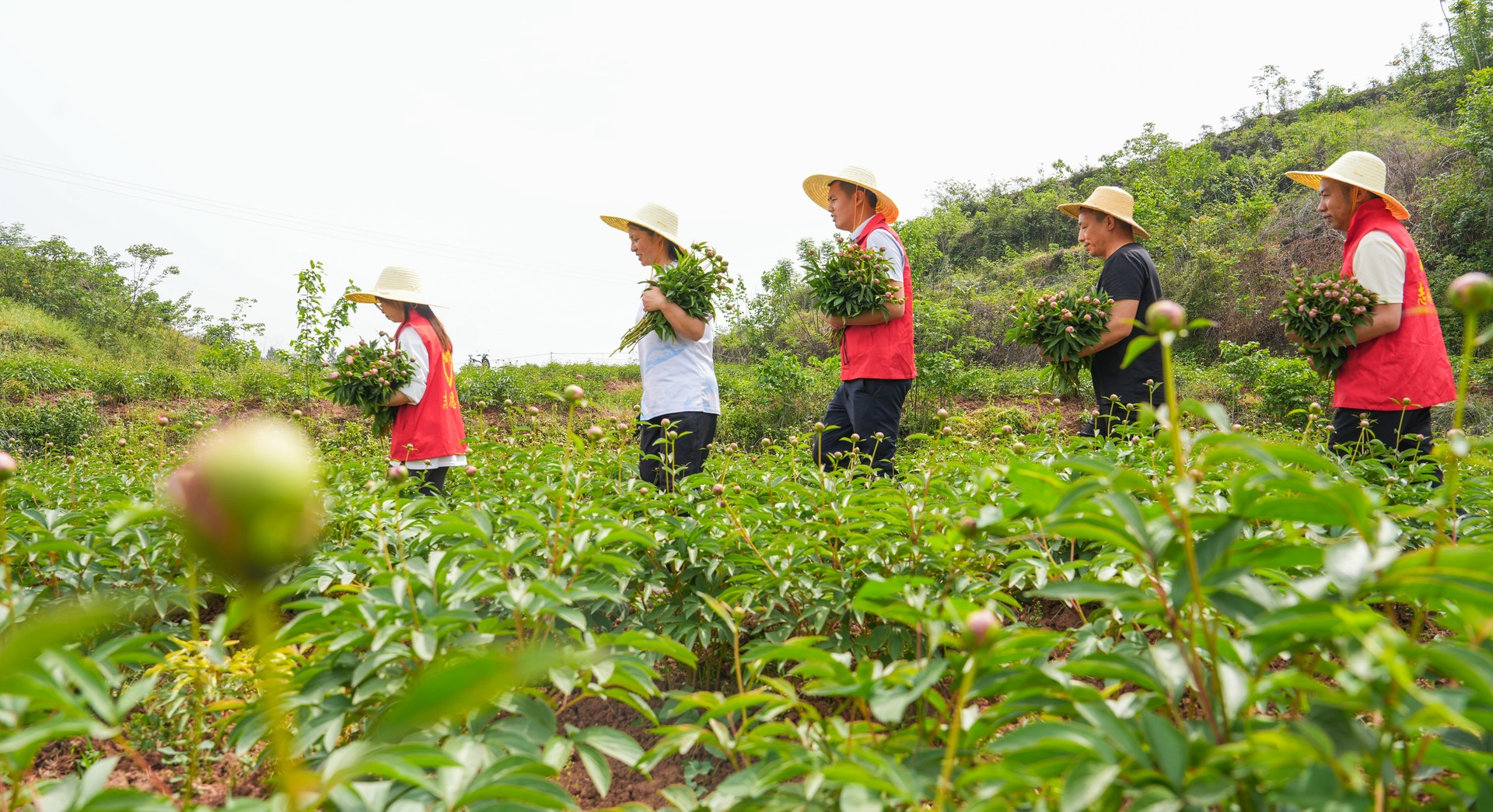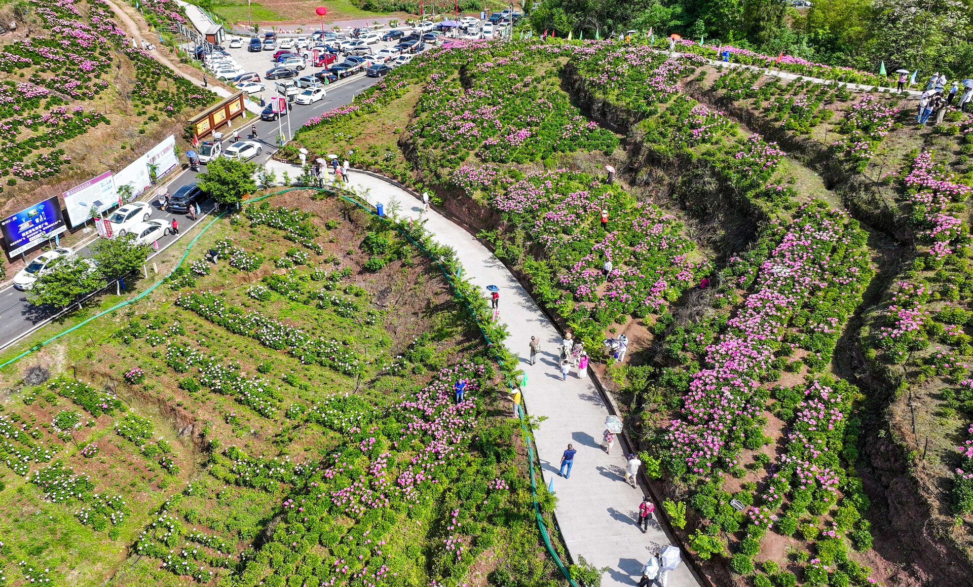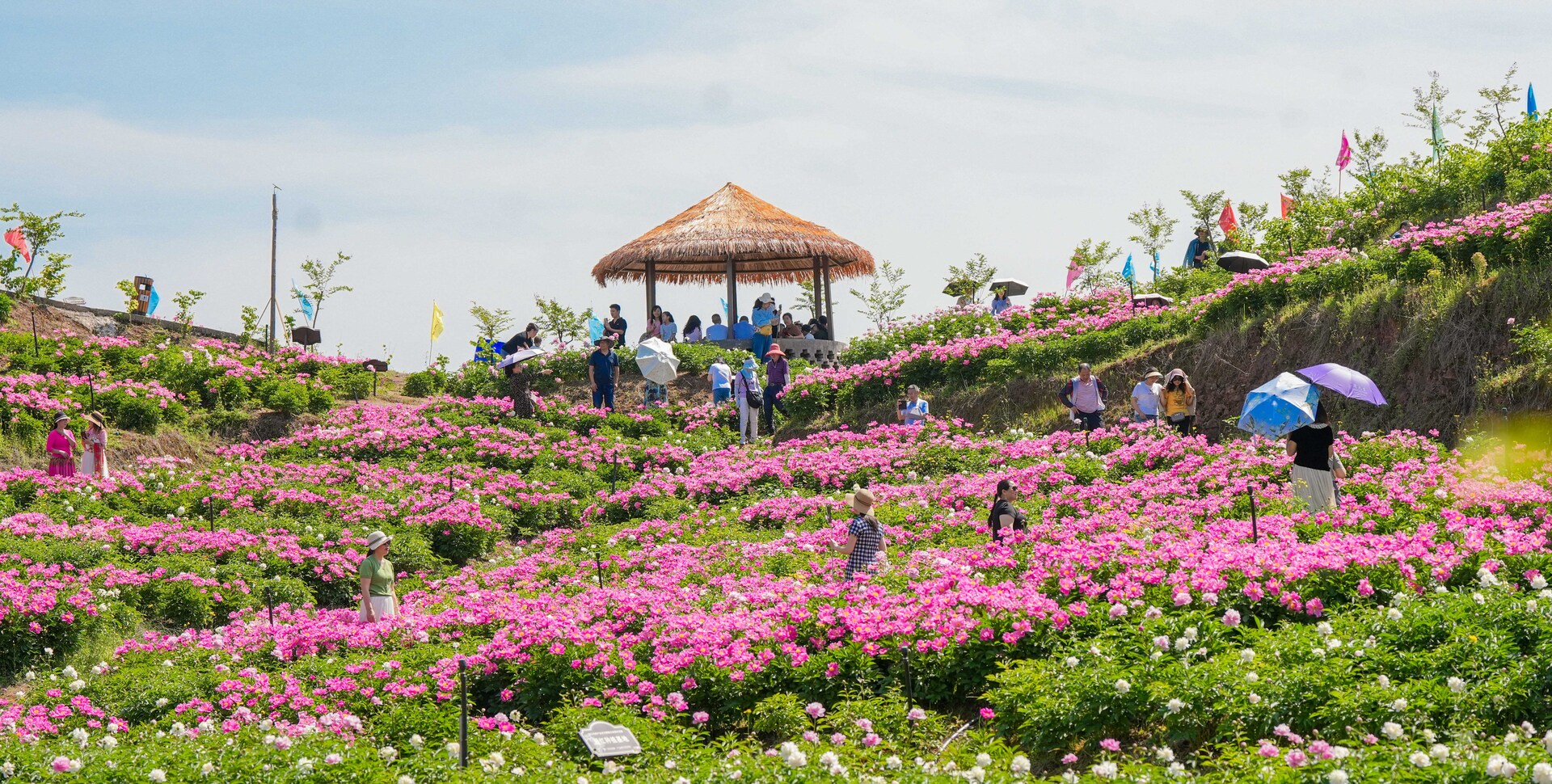 2025年4月,重庆市垫江县曹回镇徐白村芍药花基地,成片的芍药花竞相绽放,游客徜徉在花海里赏花。