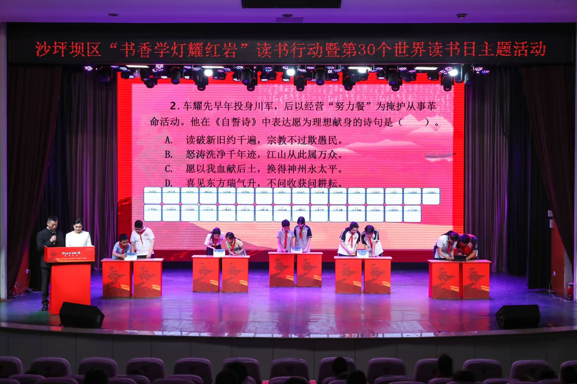 4月21日,由重庆市沙坪坝区和重庆红岩革命历史文化中心联合主办的“书香学灯耀红岩”读书行动暨第30个世界读书日主题活动在沙坪坝区儿童艺术学校举行。来自沙坪坝区各中小学以及重庆市奉节县海成小学的31名学生,与“百人团”学生代表同台竞技,展开激烈角逐。