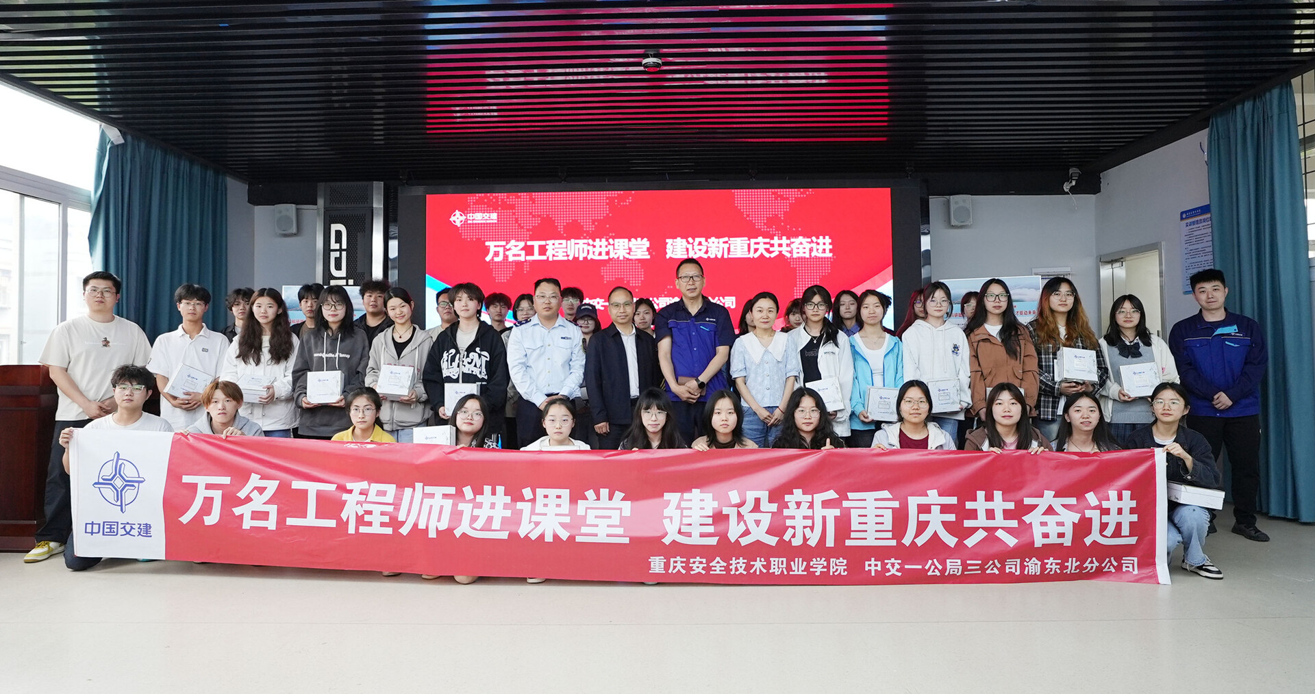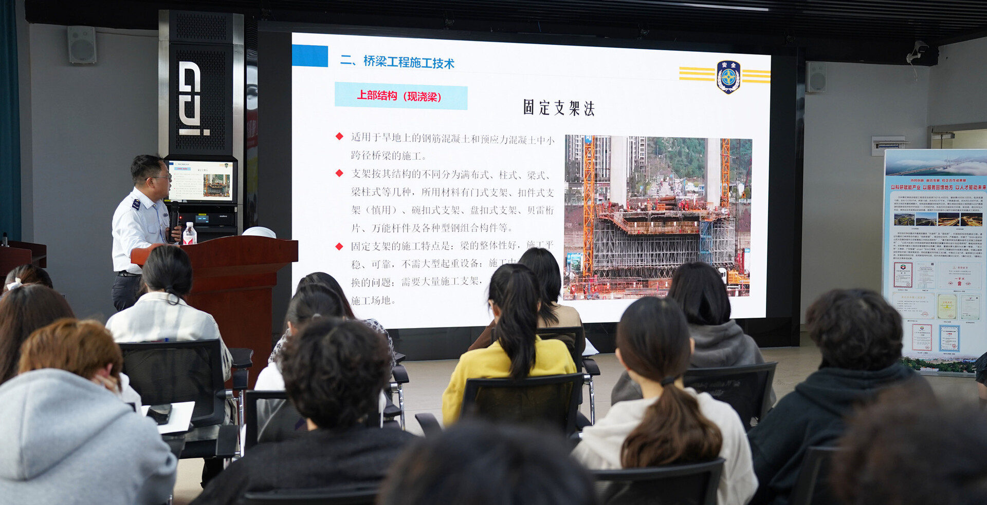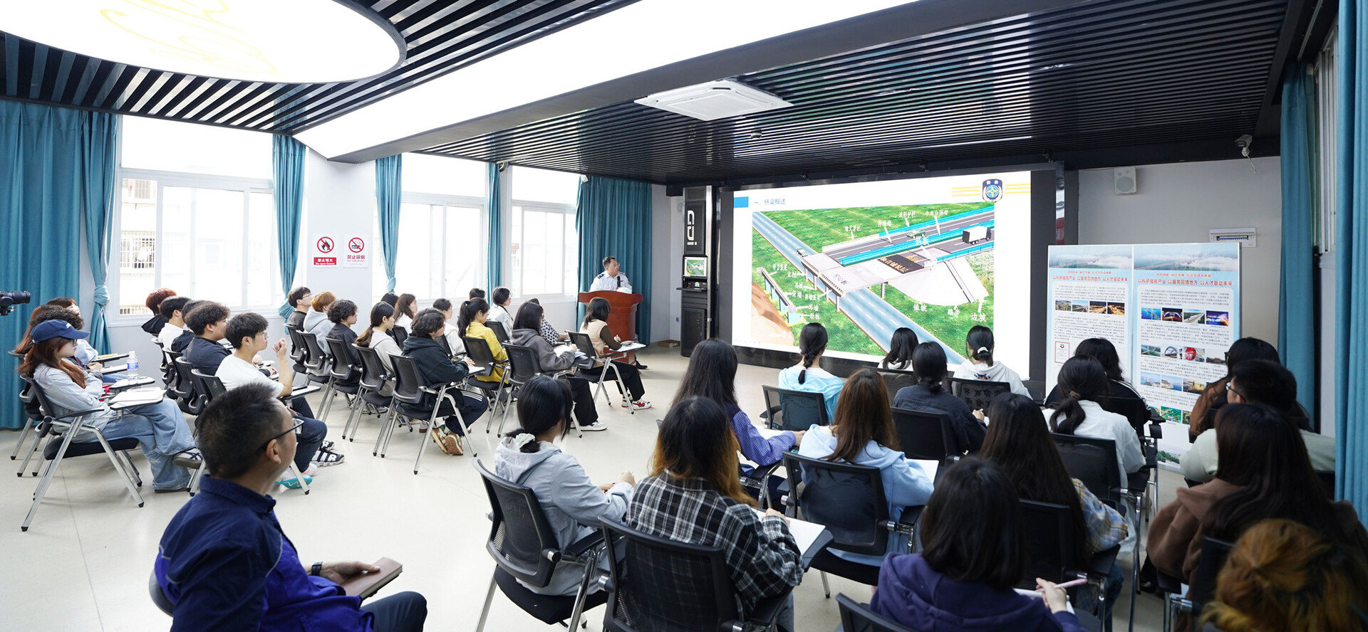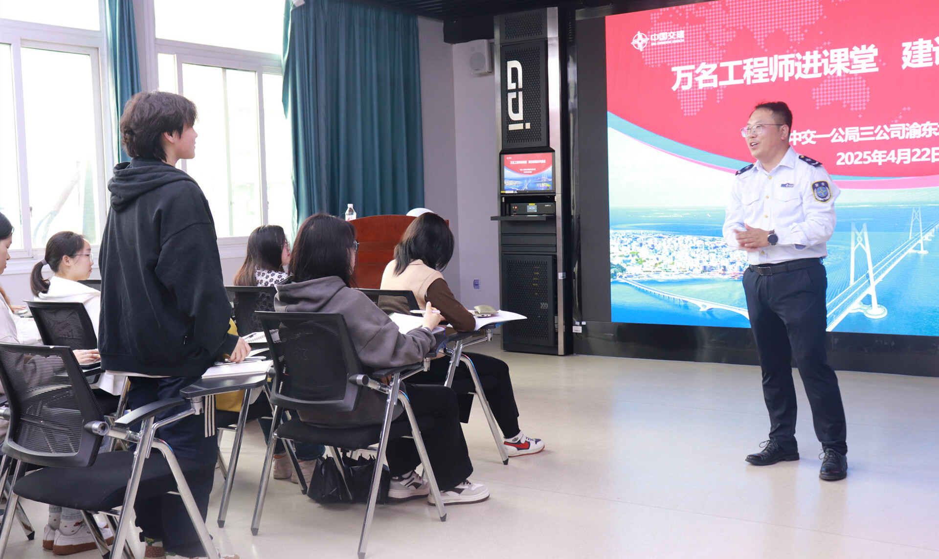 干货还远不止这些。电子大屏幕上播放着千米级跨江大桥——万州驸马桥荣登央视《超级工程》的纪录片、新田桥荷载试验的精彩航拍视频、跨越汉丰湖的开州大桥220吨上横梁吊装延时镜头……除了精心准备的PPT课件,宋光飞还给同学们逐一展示了近些年来中交一公局三公司在重庆修建的代表性桥梁工程影像,大家屏息观看,目不转睛,不时发出惊叹。