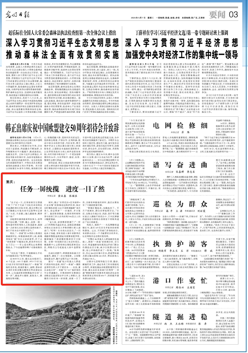 面向“一表通”统计的重点人群进行消防风险监测,利用“一表通”一键筛查事项负责人并下派任务……当前,重庆各地正将“一表通”与“141”基层智治平台贯通融合。归集到的所有数据自动推送至基层智治平台并上屏展示,各镇街目标任务一屏统揽、进度一目了然,办事效率提高的同时,基层决策也有了可靠的数据支撑。