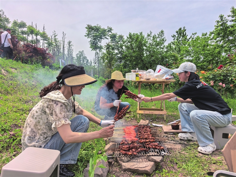 在玫瑰园里,陈女士一家正忙着烧烤:“边赏花边烧烤,这个‘五一’过得太惬意了!”