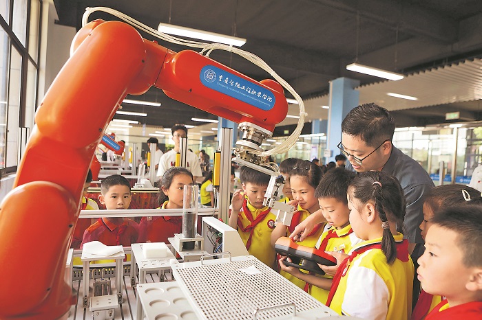 5月13日,重庆市永川区红河小学100余名学生代表踏入重庆智能工程职业学院,在华为5G数字化产教融合基地、智能交通实训基地等“智能+AI”特色场景中,展开了一场沉浸式职业启蒙体验。活动依托学校“AI+教育”深度融合优势,通过人形机器人“AI智教授”互动引导,使小学生在沉浸式体验中感受职业教育魅力,播撒智能时代职业认知的种子。