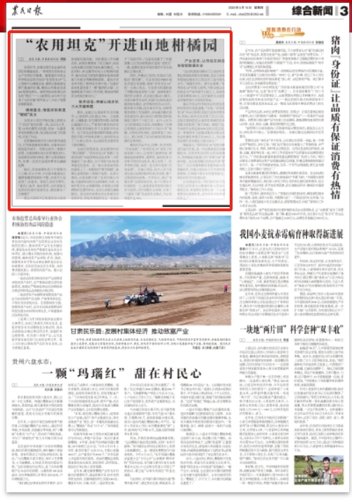 重庆市农业科学院农业科技信息研究所所长周蕊透露:“目前,‘农用坦克1#’平台已取得2项动力系统发明专利,其核心技术完全实现了自主可控,这标志着我国在山地农机领域的技术创新方面取得了重大突破。根据计划,年内该平台将完成5000亩的示范应用,这一举措将有力地推动重庆丘陵山区农业机械化率提升至60%以上,为山地农业现代化发展注入强大动力。”
