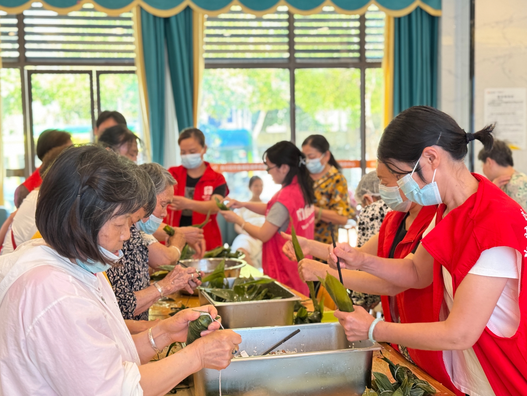 “糯米要压实,粽叶得裹紧……”巴湾社区活动室内,居民们围坐一桌,手持青绿粽叶卷成漏斗状,填糯米、放红枣,指尖翻飞间,三角形的粽子堆成小山。社区工作人员将煮熟的粽子分装成盒,逐一送到孤寡老人、退役军人及老党员手中,为他们送去端午的祝福与问候。