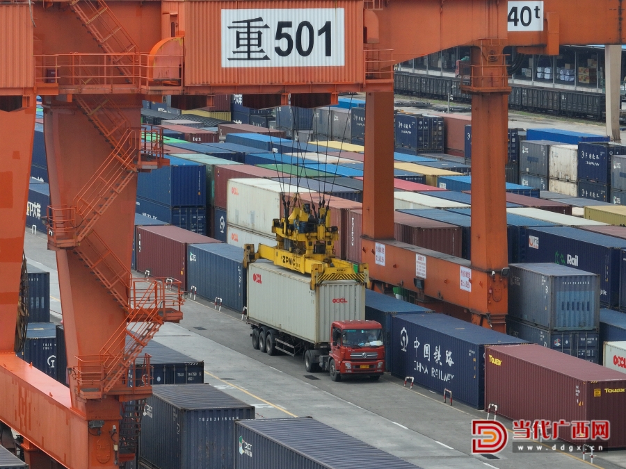 离重庆无水港不远的中铁联集重庆中心站,是西部陆海新通道的铁路重要站点。记者看到,站内运输集装箱的卡车往来不绝,堆成小山似的五彩集装箱准备外运。中心站运营部外勤主任刘代鹏2011年到中心站工作以来,深刻感受到西部陆海新通道从重庆出发至钦州港的铁海联运班列班次越来越多,货品品类也变多了。“汽车、大型机械、医药产品都往那边运,今天就有发往钦州港的班列。”他说。