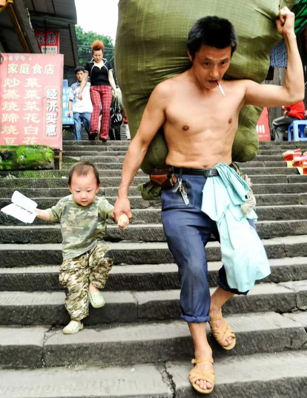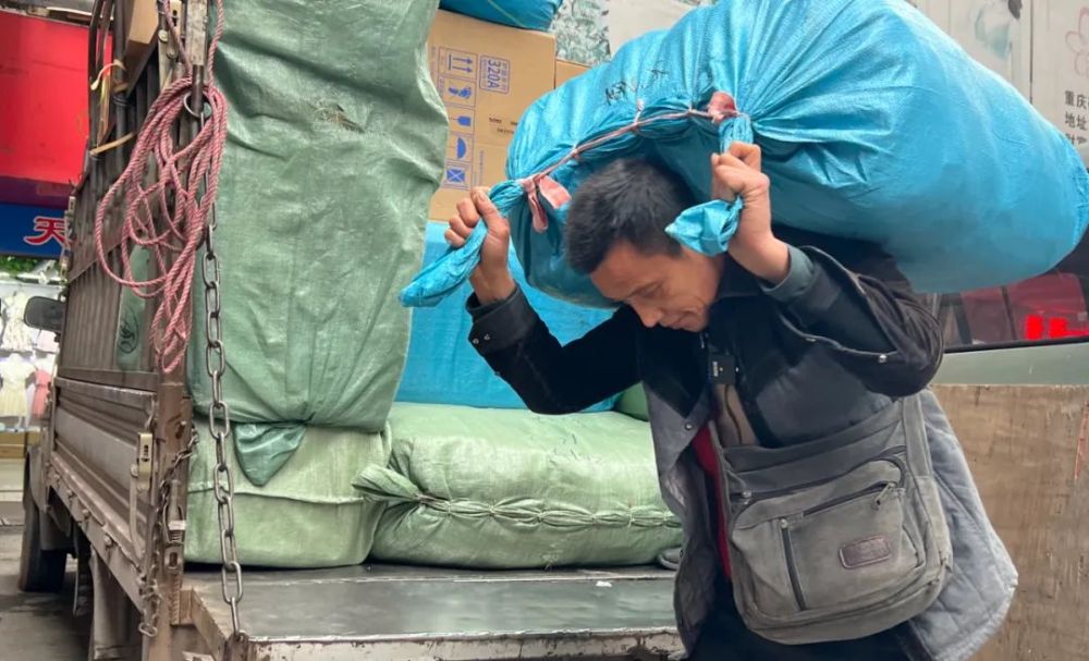 一位父亲肩扛一大麻袋货物