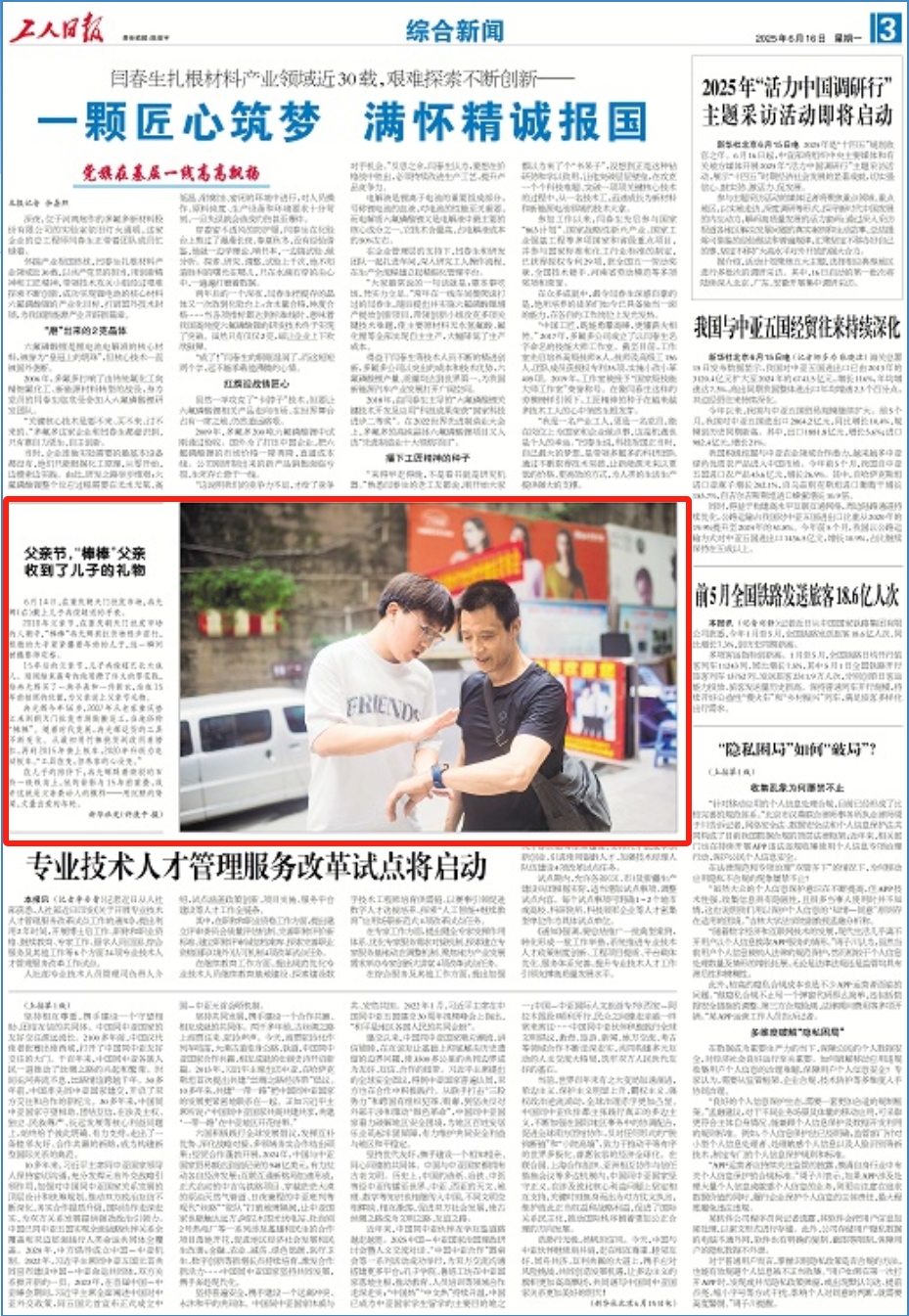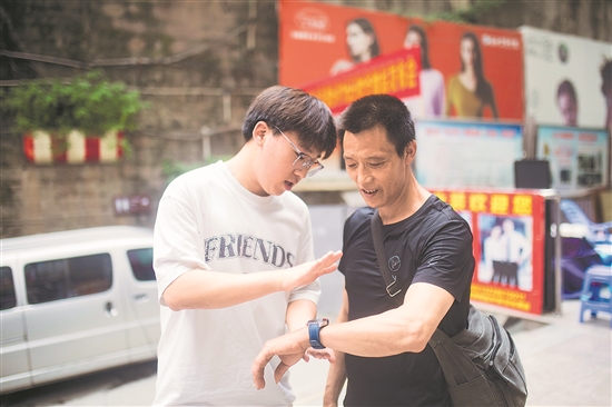 15年后的父亲节,儿子冉俊超已长大成人。刚刚结束高考的他用攒了许久的零花钱,给冉光辉买了一块手表和一件新衣,站在15年前拍照的位置,为父亲送上父亲节礼物。