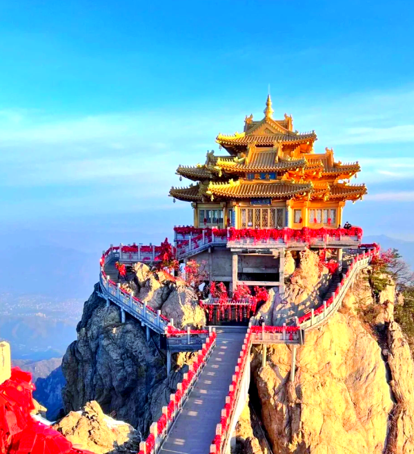 将要到达山顶时,金顶道观群出现在眼前,金色的屋顶与周围的青山绿树相互映衬,宛如天上的宫殿降临人间。沿着山间的步道漫步,欣赏着绝妙的风景,呼吸着清新的空气,仿佛所有的烦恼都被抛到了九霄云外。站在山顶的观景台上,云海正漫过马鬃岭,千峰化作蓬莱仙岛,金殿檐角的铜铃在风中摇晃,铃声撞碎云雾,露出峰顶若隐若现的晒布崖。山风裹挟着松香灌入衣襟,忽然懂得了徐霞客笔下“云铺深壑,絮掩危峰”的震撼。
