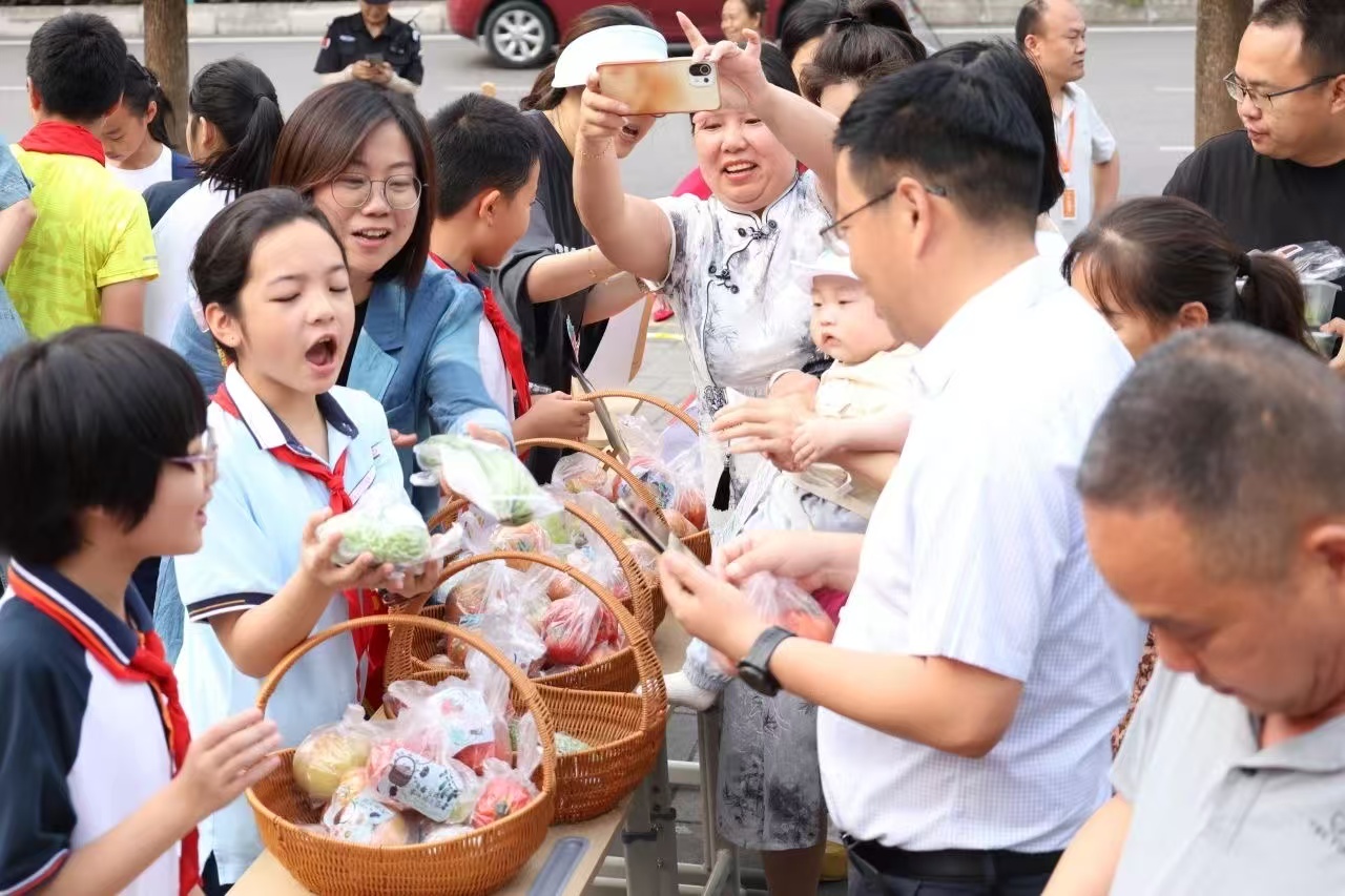 三是队员实践,星光闪耀。少先队员们是当之无愧的“星光使者”。他们亲身参与蔬菜种植、采摘、包装、定价、宣传、售卖全过程。义卖现场,少先队员们分工明确:销售员热情推介、宣传员妙语吆喝、收银员一丝不苟、秩序员引导有序。这份“全程实践”,让队员们在真实的劳动场景和财商体验中,深刻理解奉献与责任。