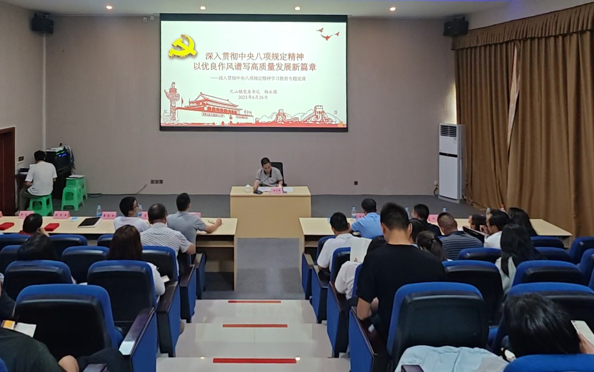 巴山镇党委书记杨永国以“深入贯彻中央八项规定精神 以优良作风谱写高质量发展新篇章”为主题,深入剖析工作中可能存在的作风问题及其潜在危害,要求全体党员干部必须时刻保持清醒头脑,自觉筑牢拒腐防变的思想防线,为全体党员干部讲授了一堂主旨鲜明、内涵深刻的专题党课。