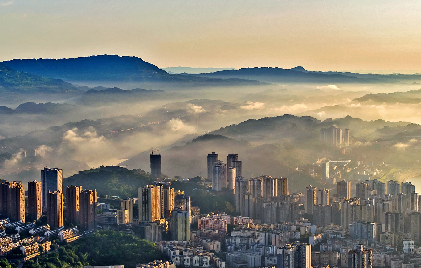 在热情奔放的朝阳照射下,船只在金光闪闪的江面上缓缓行驶,江岸的山岭之间云雾缭绕,崇山峻岭、高楼大厦、地标建筑宛若出水芙蓉……把“日破云海出,人间皆浪漫”的意境表现得淋漓尽致。