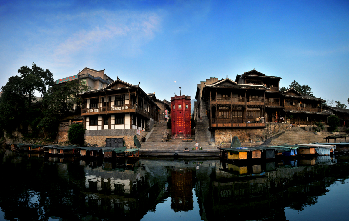 伴随清脆桨声,不到5分钟,一艘满载游客的小船便从重庆洪安镇这头的洪茶渡口,轻盈划过清水江水面,抵达对岸湖南边城镇的茶洪渡口。