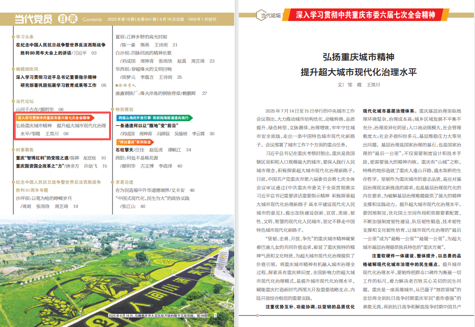 习近平总书记在重庆考察时指出,重庆是我国辖区面积和人口规模最大的城市,要深入践行人民城市理念,积极探索超大城市现代化治理新路子。日前,中国共产党重庆市第六届委员会第七次全体会议审议通过《中共重庆市委关于全面贯彻落实习近平总书记重要讲话重要指示精神 积极探索超大城市现代化治理新路子 高水平建设现代化人民城市的意见》,提出加快建设创新、宜居、美丽、韧性、文明、智慧的现代化人民城市,坚定不移走中国特色城市现代化新路子。