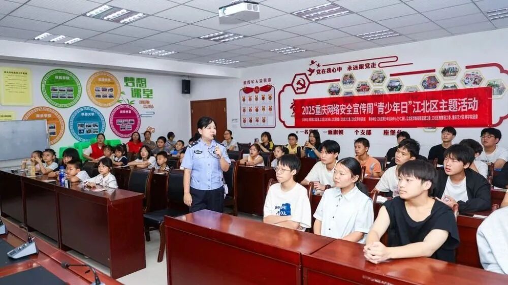 江北区“青少年日”主题活动现场,区公安分局网安支队的民警结合自身办案经验,详细讲解网络安全常识。现场还模拟了社交、游戏等情景,邀请青少年参与互动演绎。