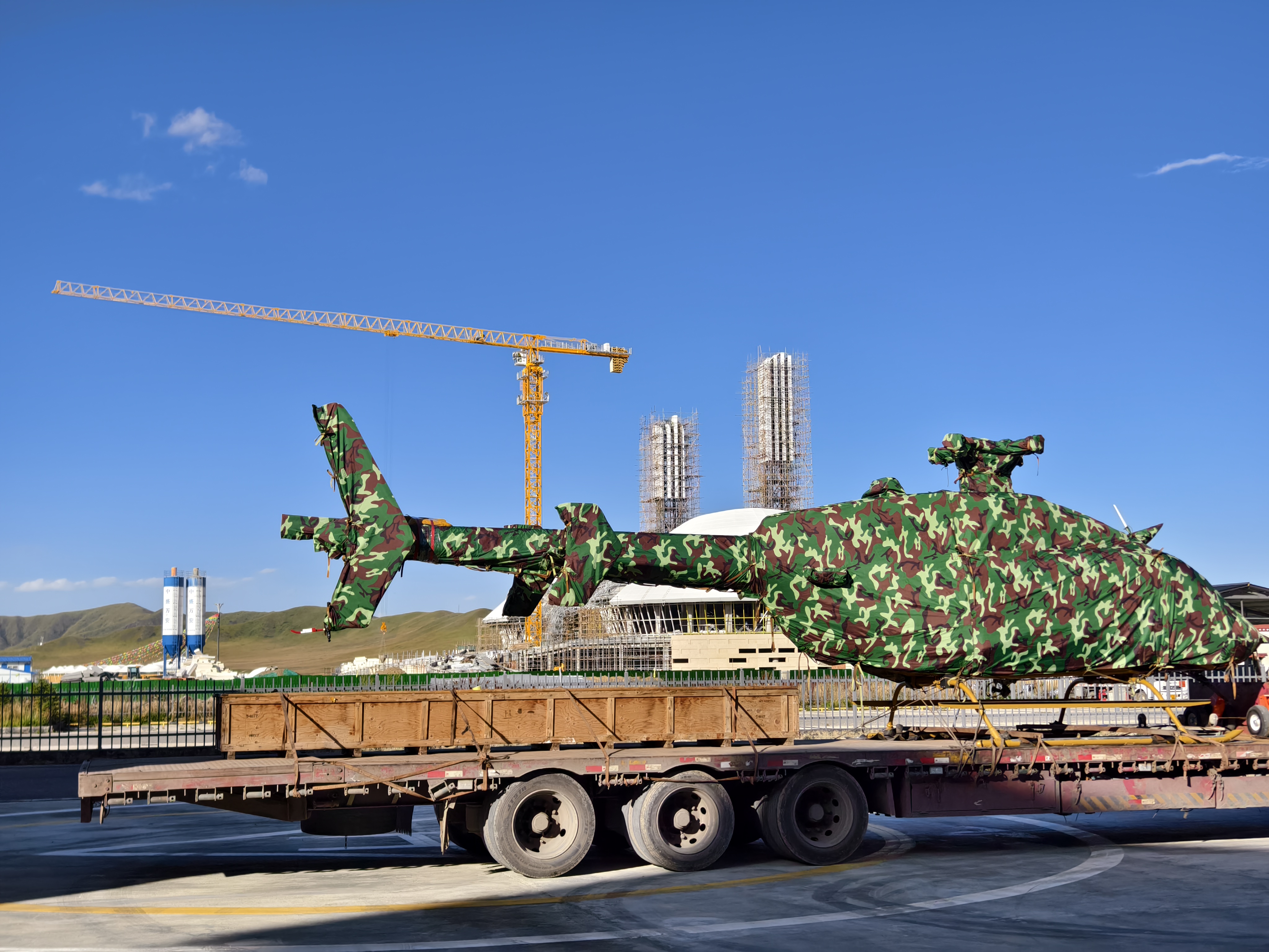 23日,若尔盖县唐克镇若尔盖县低空飞行中心,停机坪上停着一架裹着迷彩布的直升飞机。