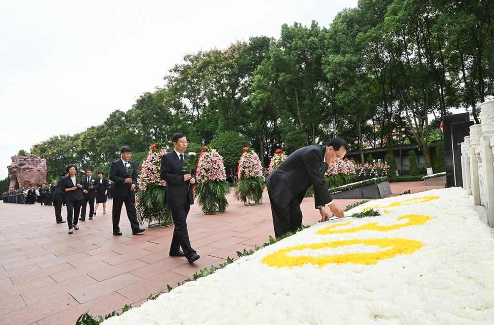 军乐团奏响深情的《献花曲》,18名礼兵稳稳抬起花篮,正步向前,将花篮整齐摆放在烈士墓前。袁家军、胡衡华、王炯、程丽华来到花篮前,驻足凝视,整理缎带,同社会各界代表一起绕行烈士墓,敬献鲜花,向革命先烈表达深切缅怀和崇高敬意。