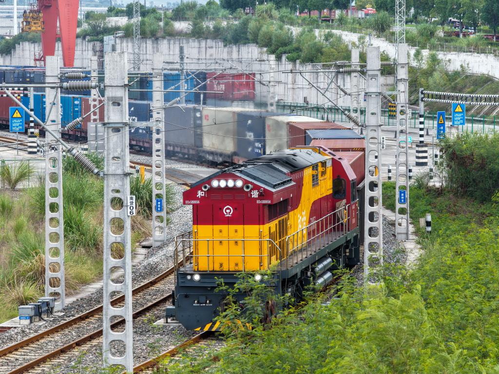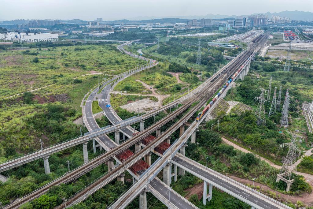 现场调度员逐一检查集装箱,龙门吊有条不紊地装载货物,班列司机认真进行发车前最后检查……国庆中秋假期里的清晨,位于中国西部直辖市重庆的团结村中心站延续着日常的喧闹。