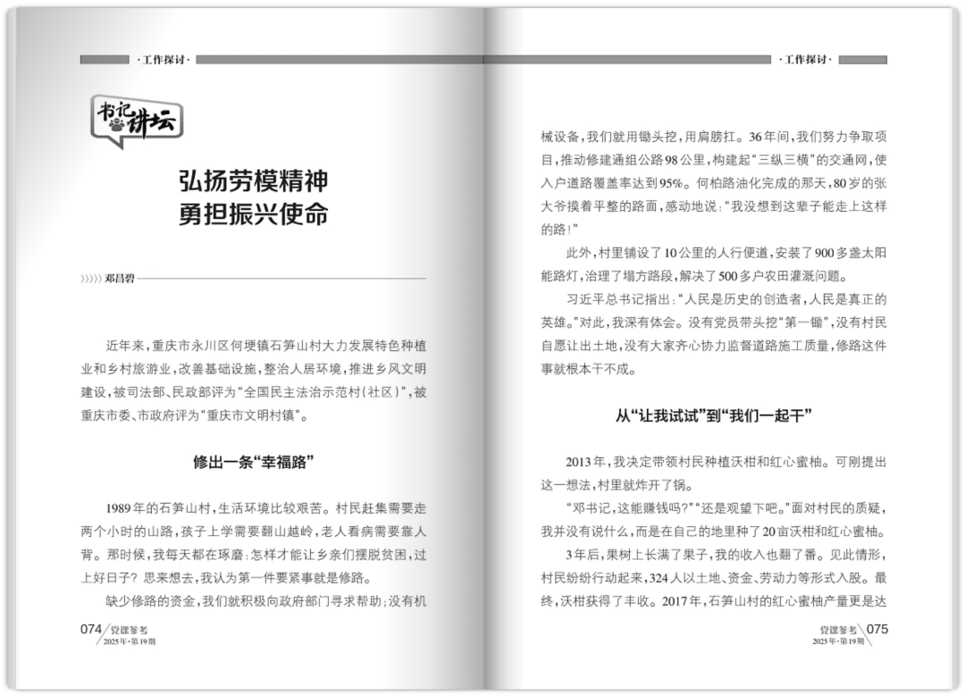 10月13日,《党课参考》2025年第19期“书记讲坛”专栏刊载重庆市永川区何埂镇石笋山村党委书记、村委会主任邓昌碧的工作探讨——《弘扬劳模精神 勇担振兴使命》,现将原文转载如下: