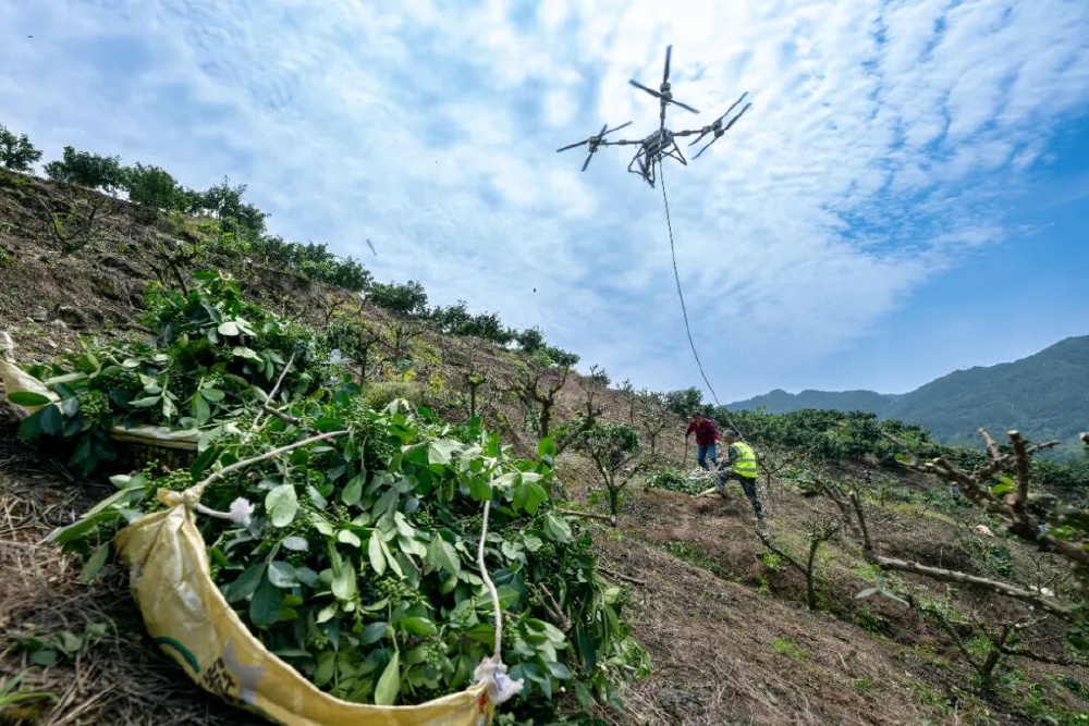 ▲▲6月10日,涪陵江北街道北雁村,无人机帮助农民们将地里采收完的花椒运往加工点。记者 张春晓 摄/视觉重庆