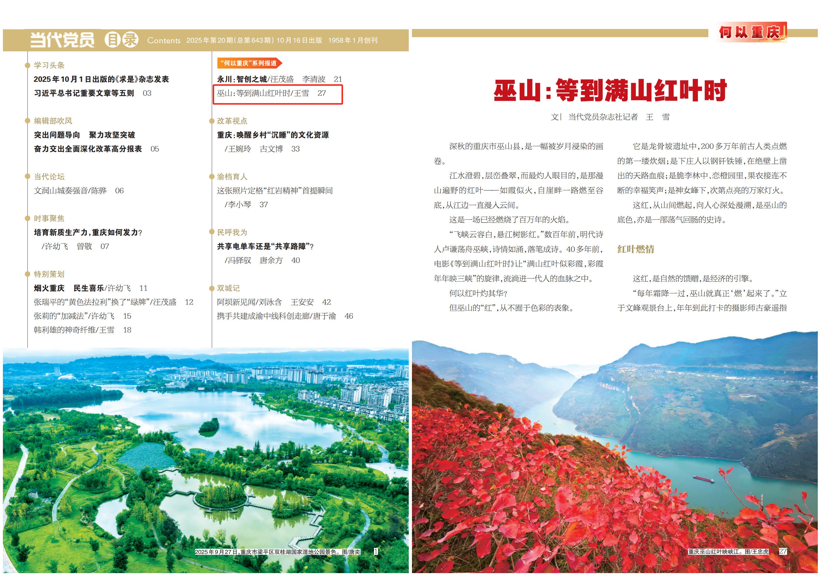 “飞峡云容白,悬江树影红。”数百年前,明代诗人卢谦荡舟巫峡,诗情如涌,落笔成诗。40多年前,电影《等到满山红叶时》让“满山红叶似彩霞,彩霞年年映三峡”的旋律,流淌进一代人的血脉之中。