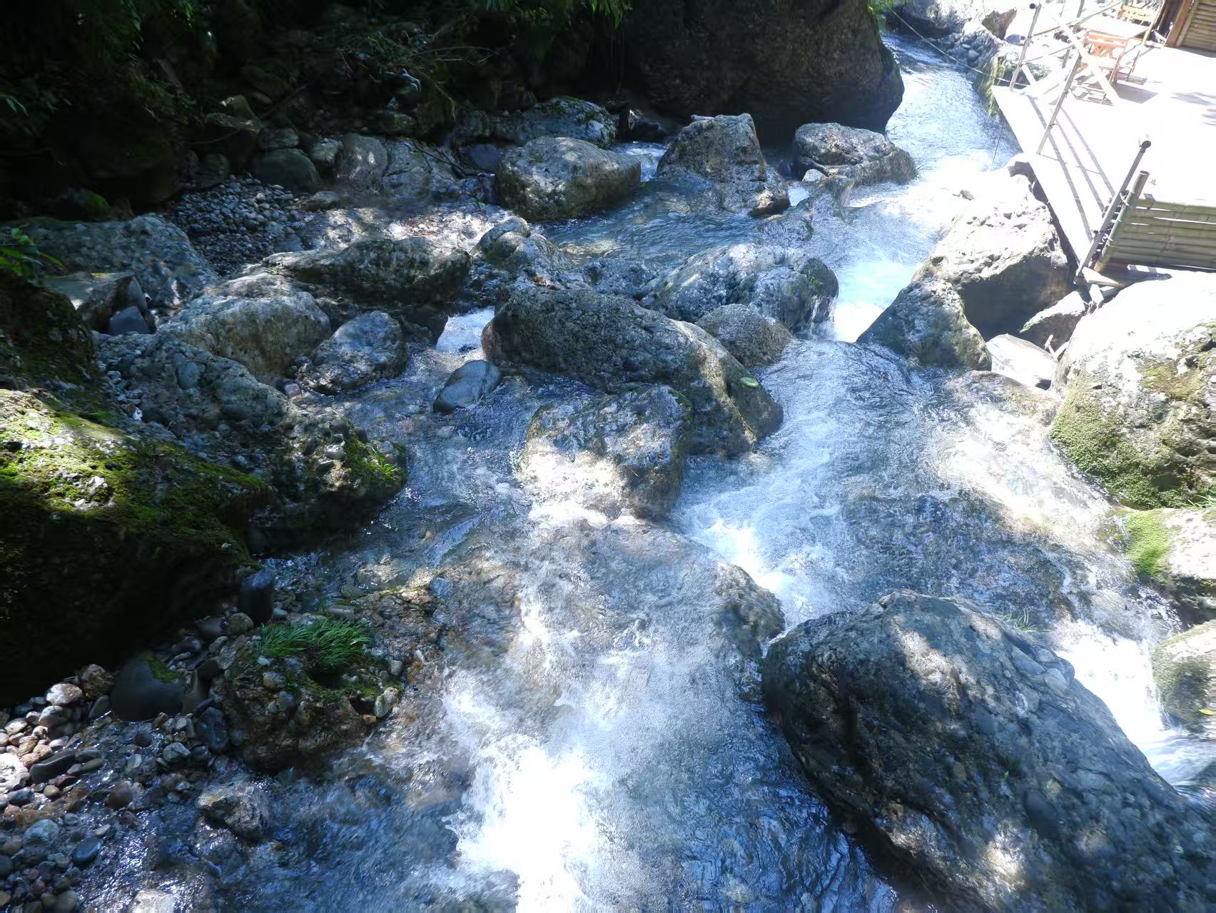 沿着飞泉沟往上爬一个多小时,就能看到一块潮湿的山壁。山壁下,有一个木板搭的小卖部。一位皮肤黝黑、眼角带着细密皱纹的五十多岁男人坐在木板朝内的位置,手里拿着一把蒲扇,不紧不慢地摇着。看到有气喘吁吁的游客走近,他便会抬起头,笑呵呵地问一句:“坐下歇口气,喝瓶水不?”
