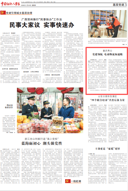 建强红色服务驿站。整合快递收发、培训指导、政策咨询等功能,同步派驻党员先锋队,以问题、责任、任务三张清单为载体,形成问题闭环解决机制,协调解决政策享有、质量追溯等问题400余项。同时,县委组织部联合职能部门成立电商护航先锋党支部,推行“服务前置+监管同步”模式,定期开展惠企政策宣讲等服务,助力电商行业规范健康发展。