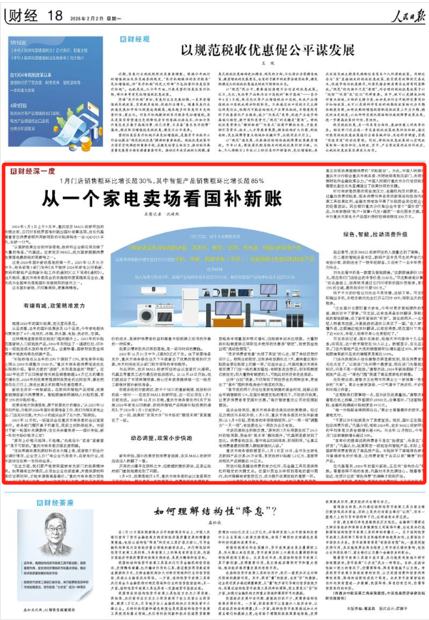 “不要以为补贴就是为了卖便宜货。相反,国补正在强力拉动消费升级。”代磊介绍,相较2024年,京东MALL杨家坪店的平均单笔交易金额增长超40%。与去年12月相比,今年1月门店销售额增长超过30%。