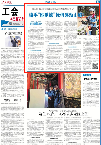 为解决部分老旧小区楼牌号掉落、缺损导致的送餐延误问题,廖泽萌发动工友在送餐间隙,用记号笔在楼栋外墙清晰标注;工友遇到电动车没电、路上摔跤、订单超时等突发状况,她总会第一时间施以援手……截至目前,廖泽萌已经进行了近100场微宣讲,向超过3万人分享劳动体验与感悟。