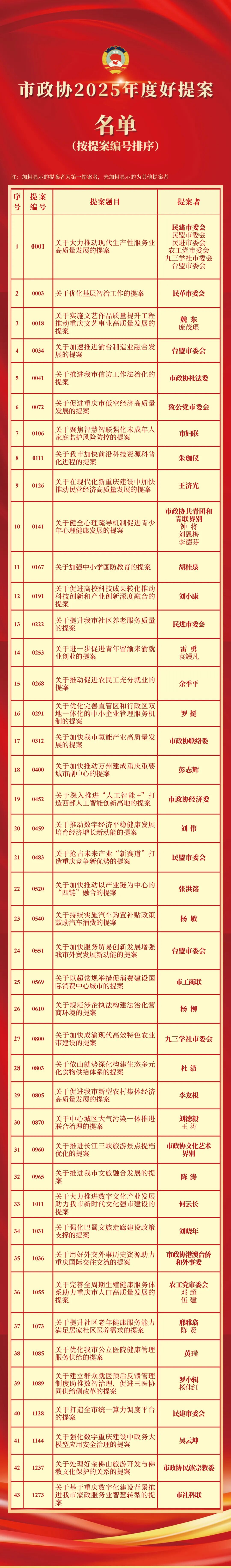 为树立典型、激励先进,充分发挥提案在政协履职和促进发展中的独特优势,在多方推荐并广泛征集意见的基础上,经研究,市政协决定对《关于大力推动现代生产性服务业高质量发展的提案》等43件2025年度好提案予以通报表扬。