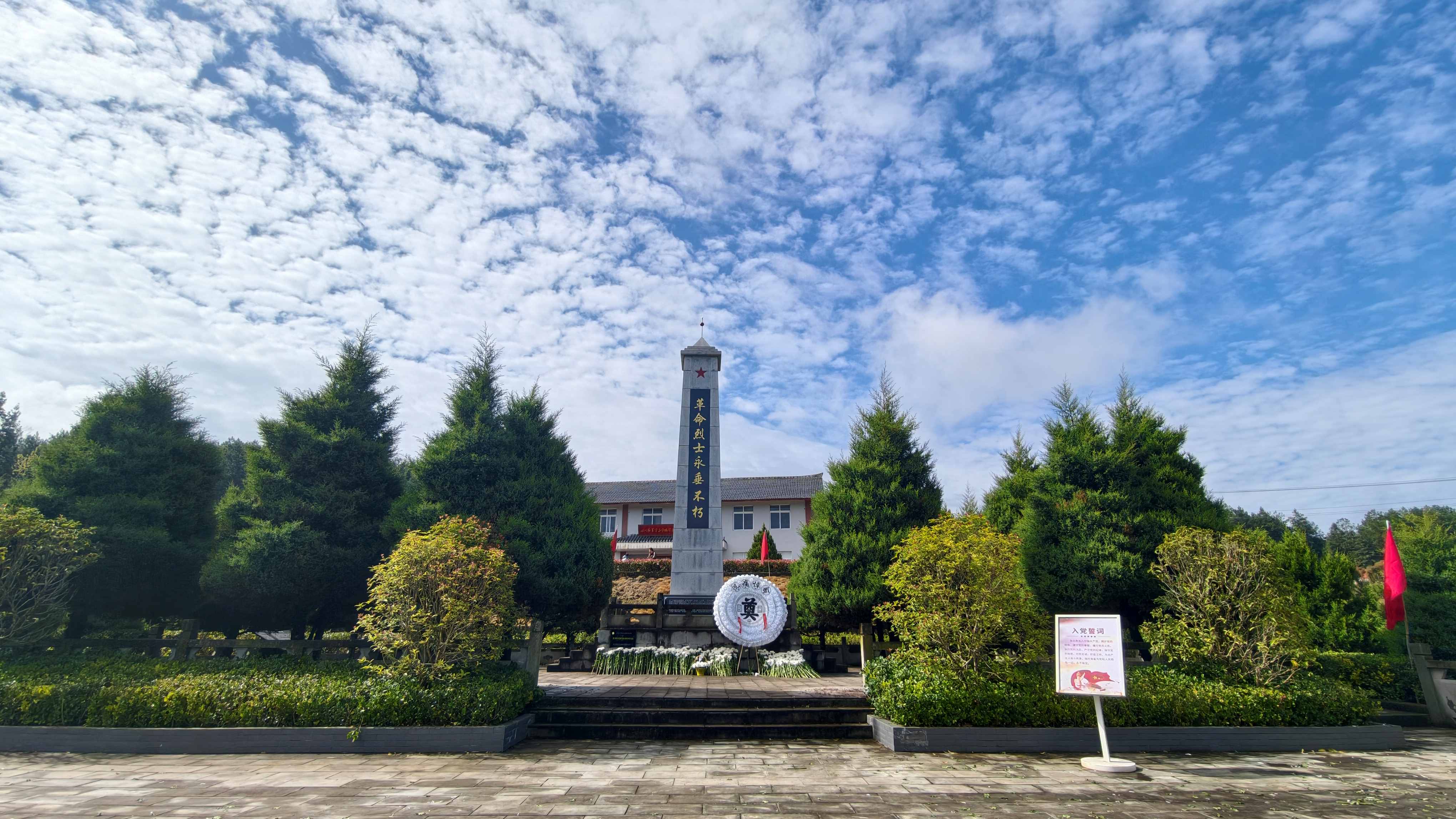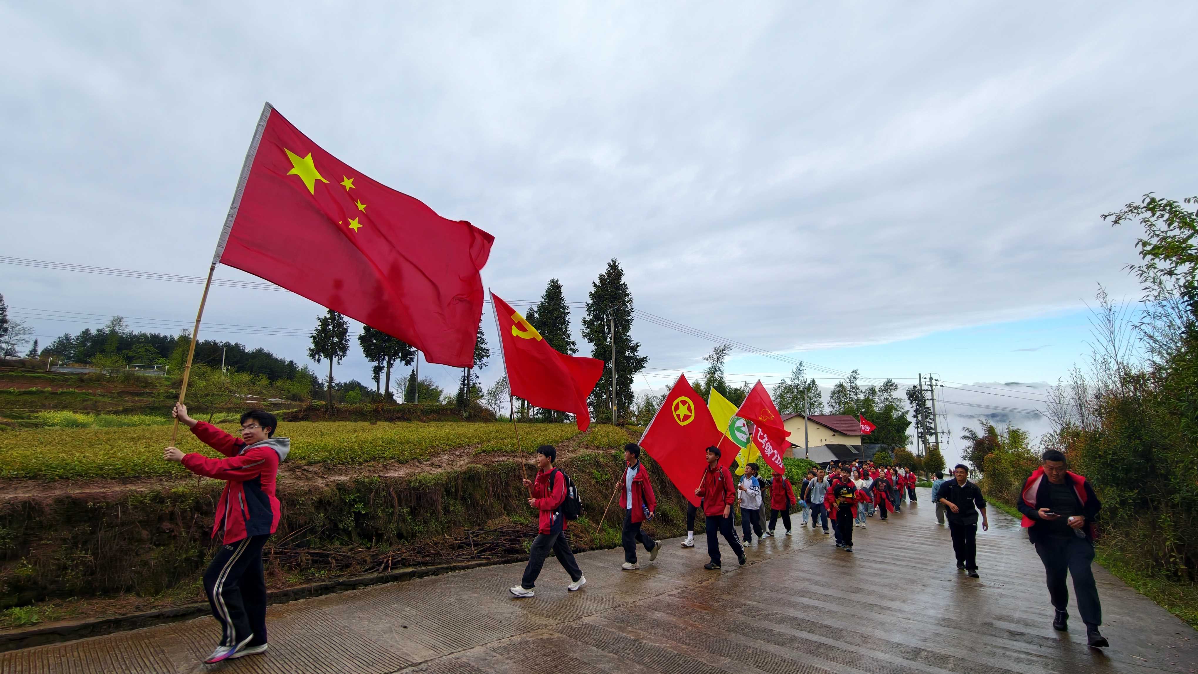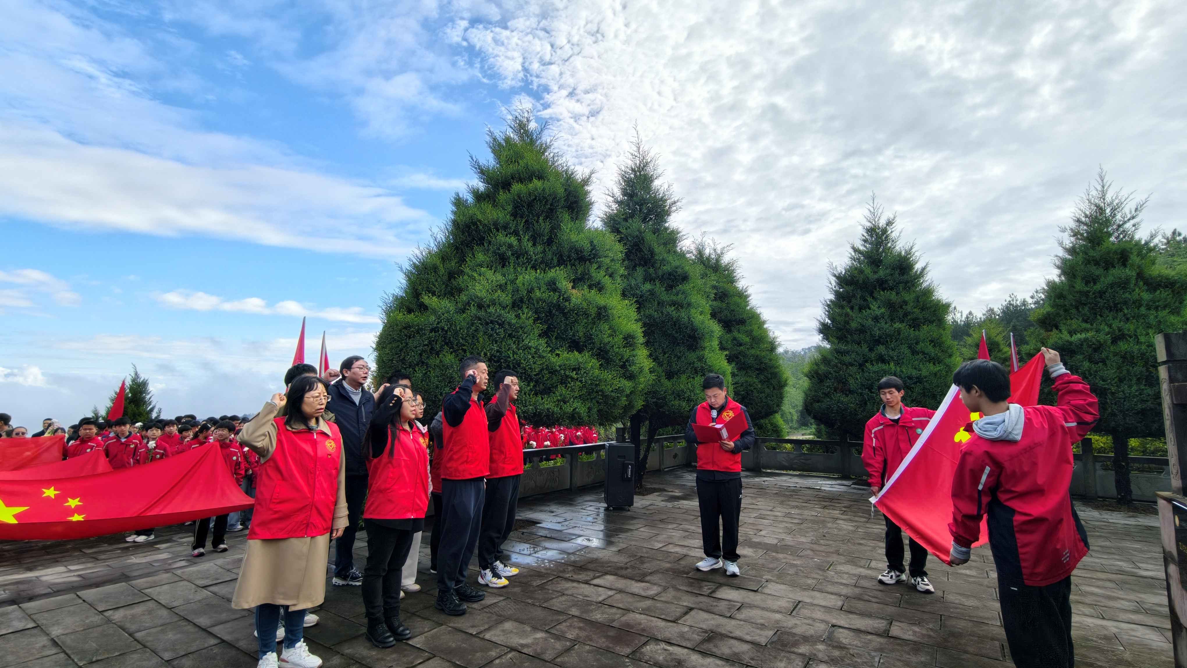早上6时,558名师生在学校集合,迎着黎明整装出发。历经3个小时的长途跋涉,学生们切身体悟到了当年红军长征的艰难困苦,深刻理解了“艰难困苦,玉汝于成”的内涵。在烈士纪念碑前,师生敬献白菊与花圈。面对先烈英灵,少先队员和共青团员代表在此立下青春誓言,铿锵的誓言在山谷中回荡。