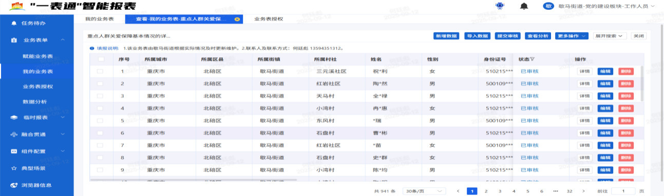 转变,始于一场“表格革命”。歇马街道设立“一表通”数据管理岗,牵头整合民政、卫健、社保等不同岗位的业务需求和数据清单,最终汇聚成一张统一的《重点人群关爱保障基本情况表》。