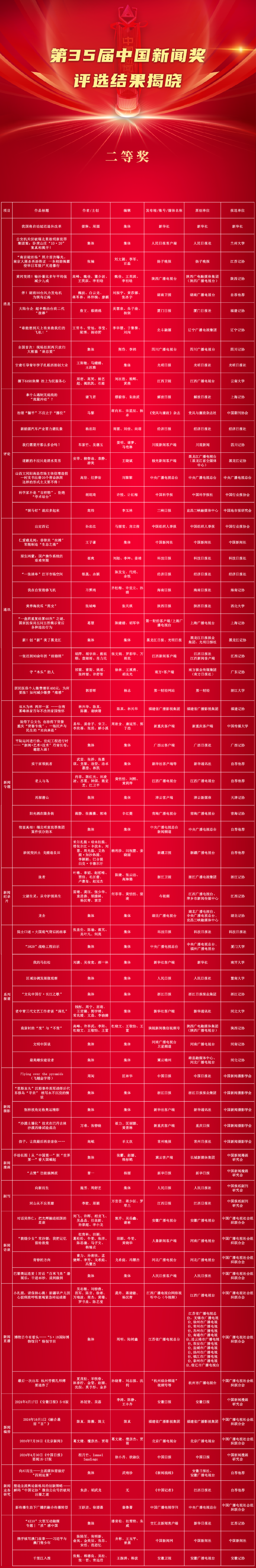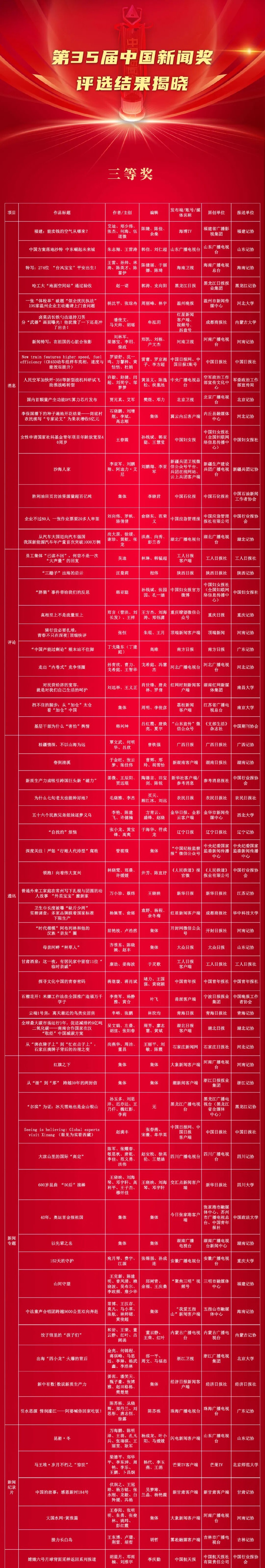由中华全国新闻工作者协会主办的第35届中国新闻奖评选结果于11月5日揭晓。来自各级各类媒体的377件作品获中国新闻奖,其中,特别奖4件、一等奖74件、二等奖113件、三等奖186件。