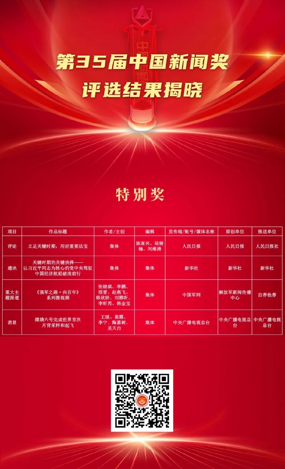 本次评选中,人民日报社评论《立足关键时期,用好重要法宝》、新华社通讯《关键时期的关键抉择——以习近平同志为核心的党中央驾驭中国经济航船破浪前行》、中央广播电视总台消息《嫦娥六号完成世界首次月背采样和起飞》和解放军新闻传播中心重大主题报道《<强军之路·向百年>系列微视频》4件作品获特别奖。