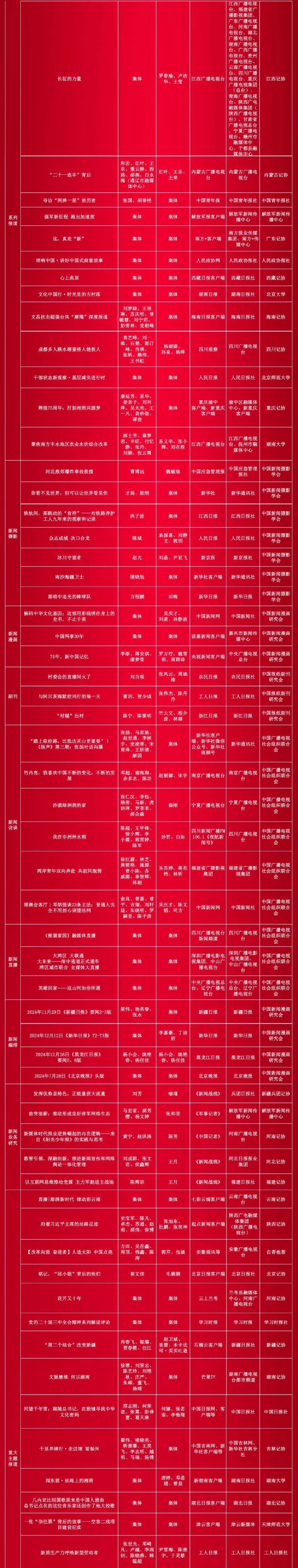 多件着眼2024年重点工作、重大典型、重要活动的优秀新闻作品获奖。光明日报新闻专栏《我在现场》、经济日报新闻专栏《数说经济》、湖南卫视新闻视频号系列报道《大国文脉》、河北卫视新闻纪录片《京津冀·瓣瓣同心》、石榴云客户端消息《3046公里!世界最长环沙漠生态屏障在新疆合龙》等作品充分展示了我国政治、经济、文化、社会、生态等各领域新征程新风貌。中国新闻周刊《整治“指尖上的形式主义”》、澎湃新闻网站《进口药“消失”之问系列报道》等舆论监督报道直面社会热点,产生广泛影响,彰显了新闻工作者的责任担当。湖北日报《牌子上墙不等于工作到位》、山西广播电视台《“悟空”撞开“三道门”》等时事评论,观点鲜明、引领有力。中国日报官方微信视频号《旧世界与新大路:被捏造的陷阱》、大河网《International friends experience Chinese ICH items in Henan(我在河南学非遗)》等国际传播作品以多元传播为渠道、生动故事为形式、文化交流为底色,向世界展示真实、立体、全面的中国形象。高等级获奖作品浏览量、转载量、互动量高,产生了“正能量、高质量、大流量”的传播效果。