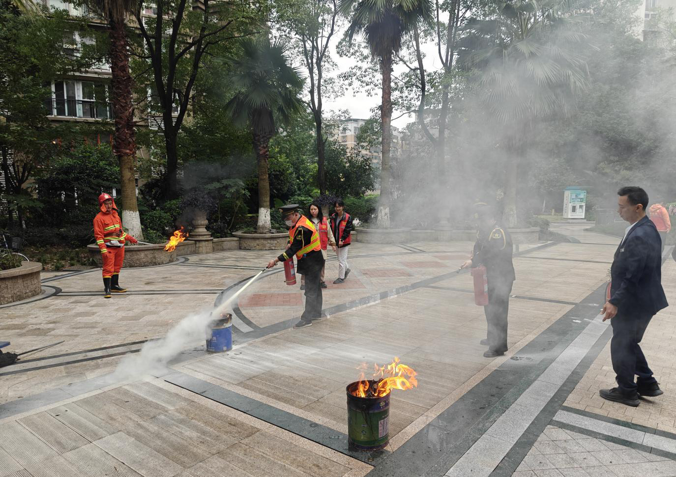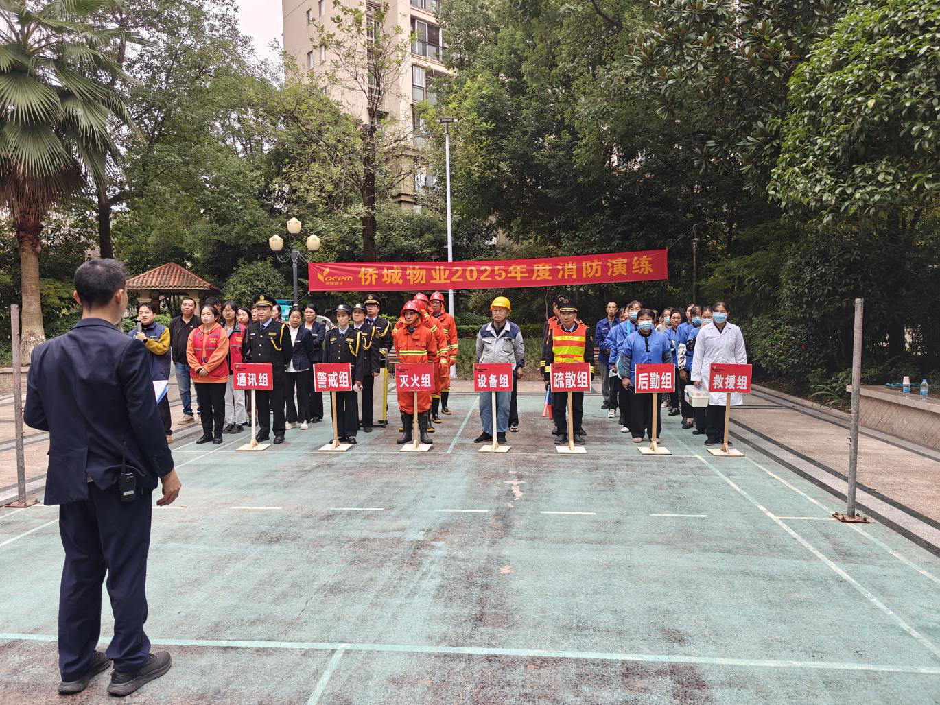 应急指挥小组立即启动应急预案,巡逻安保人员第一时间赶往现场确认火情,并通过对讲机向指挥中心汇报:“有2名居民被困,急需救援。”灭火行动组携带灭火器、水带等冲向“着火点”,扑灭初起火情并解救出被困人员;疏散引导组则逐户敲门通知居民,引导大家用湿毛巾捂住口鼻、弯腰低姿,沿着安全通道快速有序撤离至指定集合点。