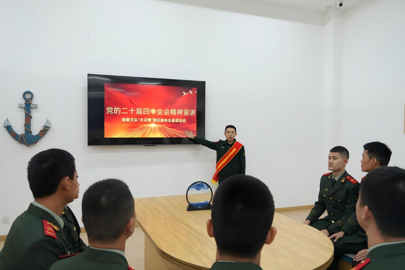 党的二十届四中全会精神速览、学习思维导图等在营区电子大屏、橱窗板报上随处可见。同时,小分队来到大队之前,还远程指导官兵创办“船舱流动小报”,提前做好理论预热。