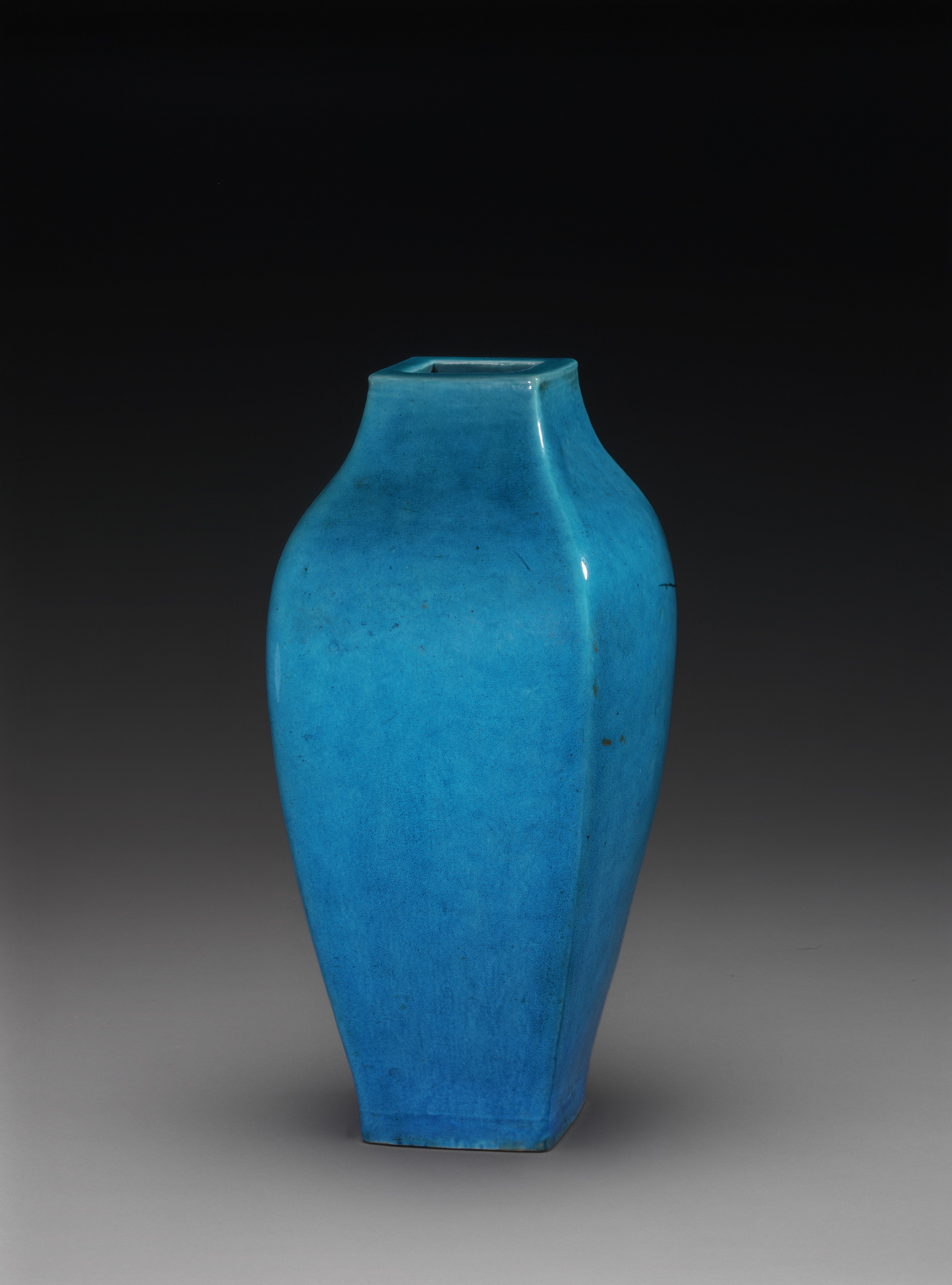 此外,方瓶本身造型也挺括利落,棱角分明,与孔雀绿釉的明艳柔润相映成趣,刚柔并济的审美意趣展现了康熙盛世高超的制瓷技艺与独特的艺术品味,被誉为后世难以超越的瓷中珍品。