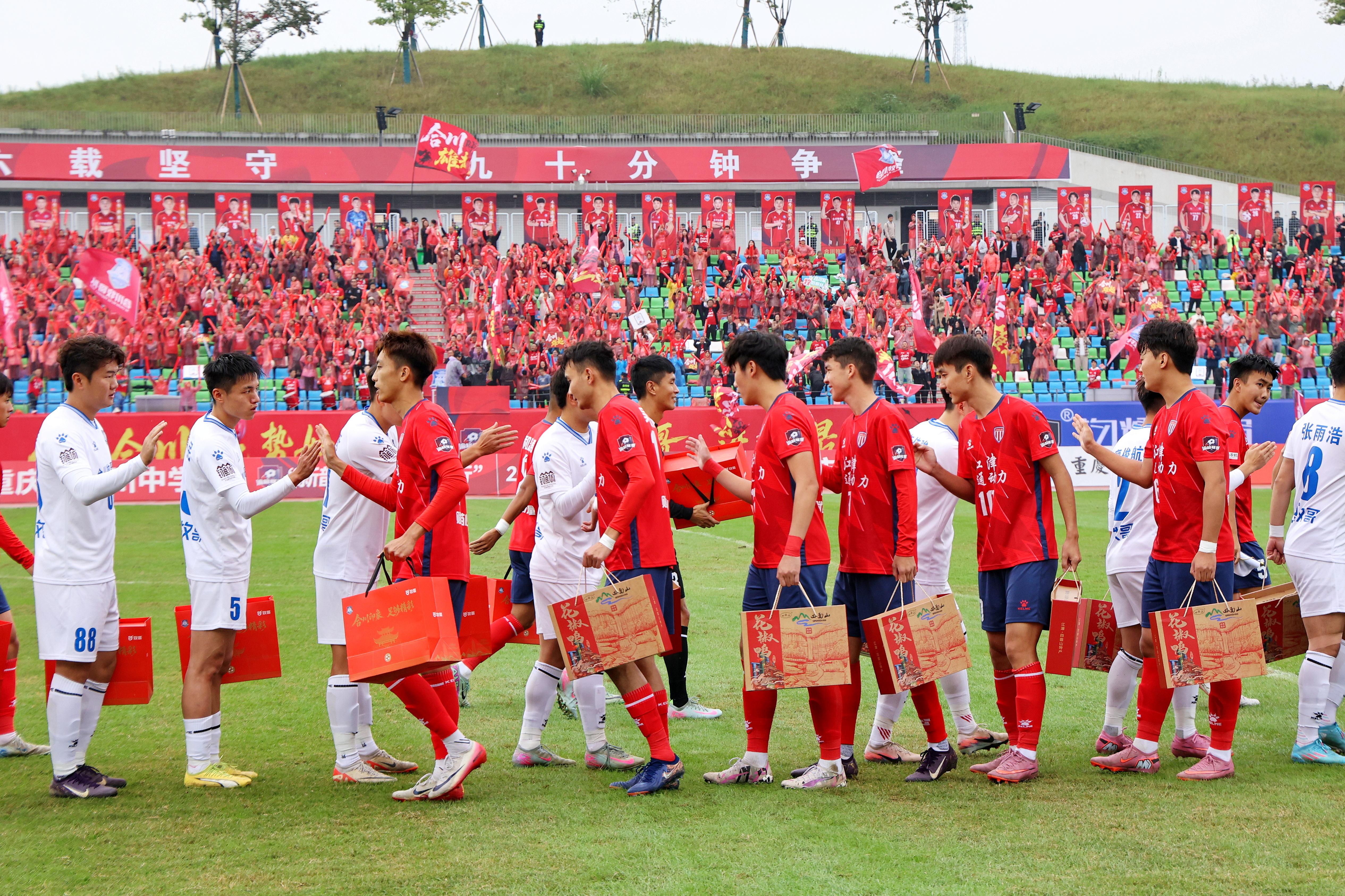 ▲11月1日,合川区体育场,合川牧哥队与江津润通动力队队员互送礼品。通讯员 刘亚春 摄