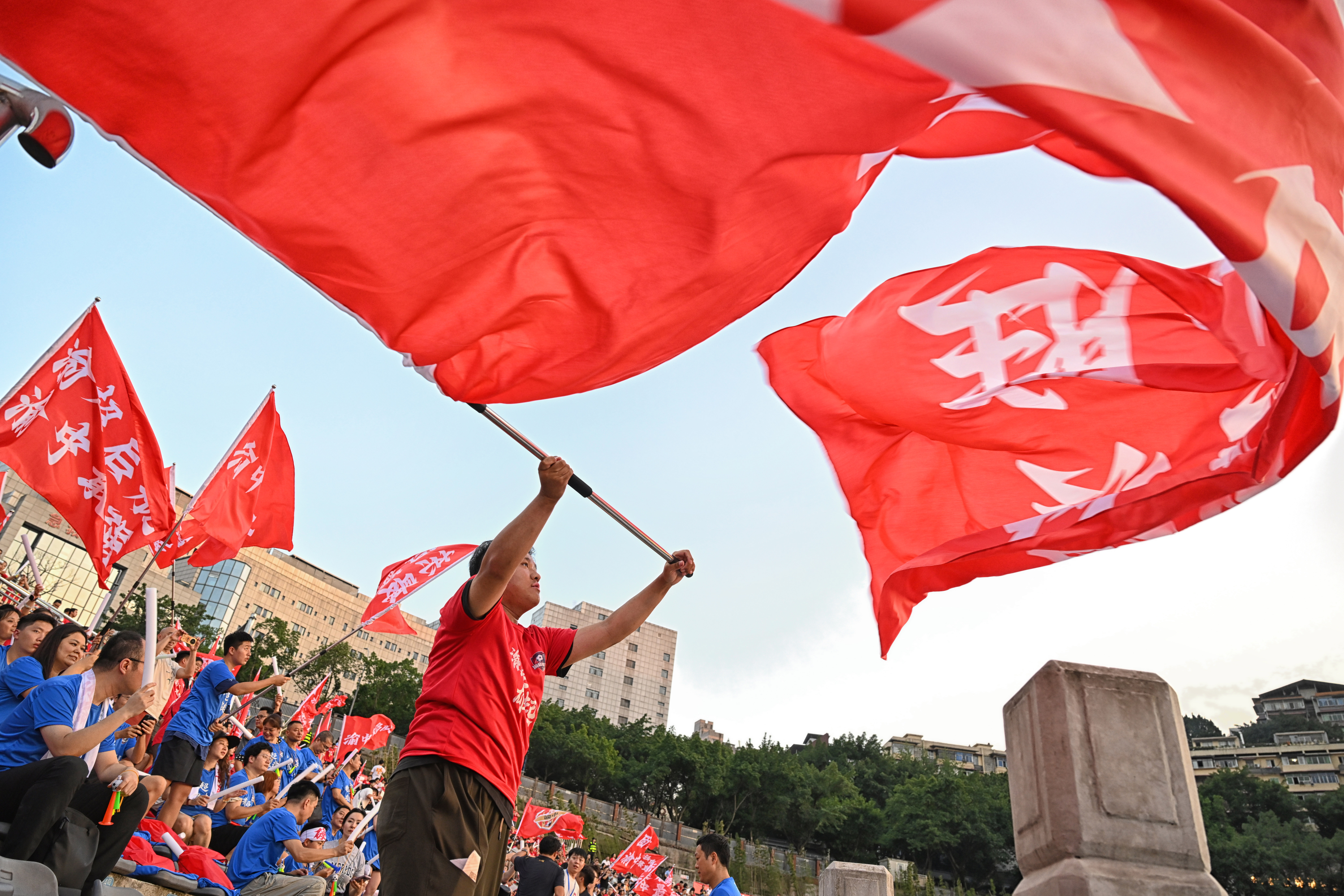 ▲9月13日,大田湾体育场,2025重庆城市足球超级联赛揭幕战现场,球迷挥舞助威旗帜。记者 万难 摄